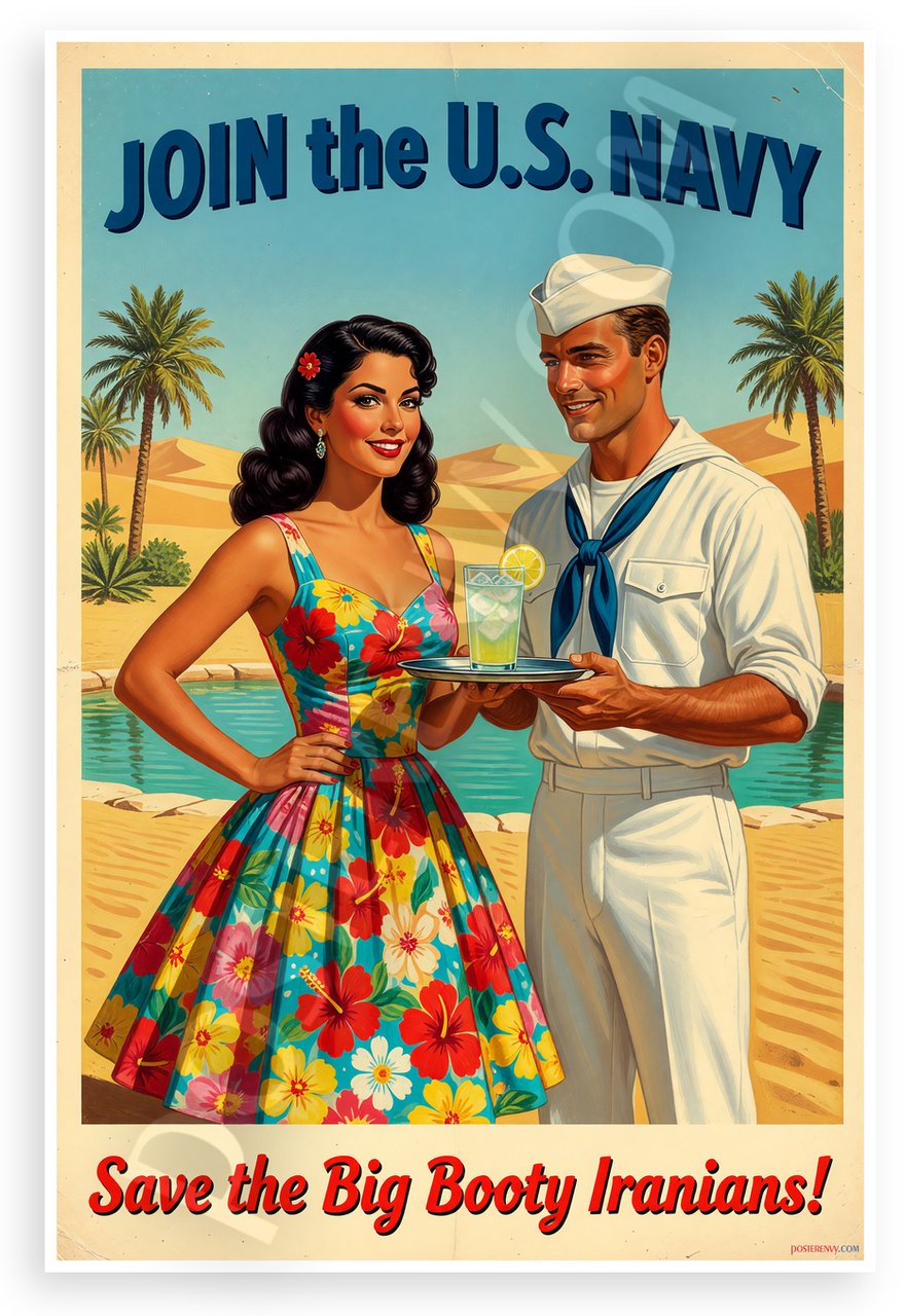 This 12x18 inch poster is printed on premium, durable paper. Proudly Made in the USA by PosterEnvy. The perfect size for any room. PosterEnvy is a family owned business, delivering top-notch posters around the world for over 20 years. Our posters are designed to last — they won't fade or pucker for years of enjoyment. Every poster features crisp, vivid artwork. We are a solar powered company. This playful vintage pin-up style recruiting poster depicts a beautiful woman in a vibrant floral dress serving a drink to a Navy airman at a sunny desert oasis with palm trees and bold text.