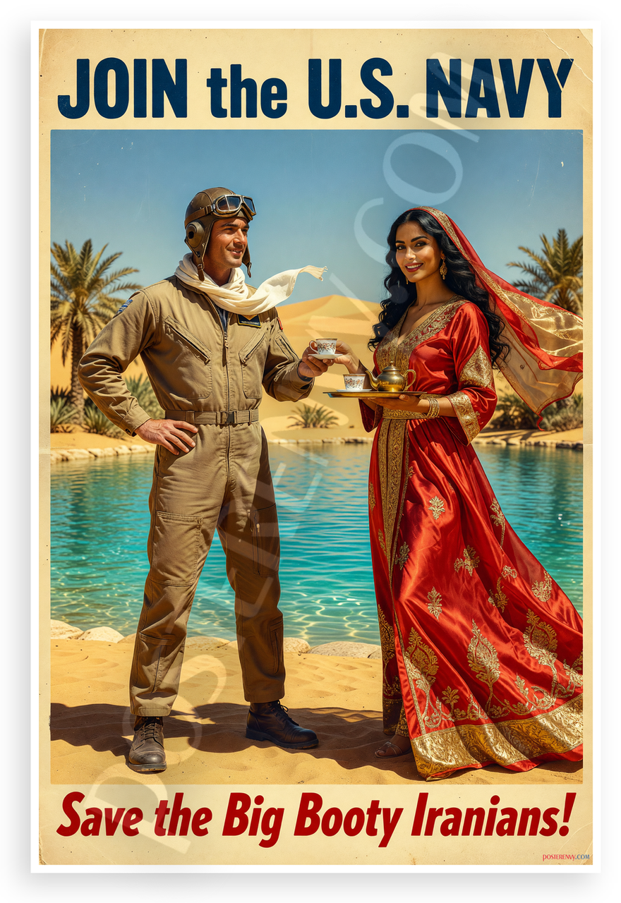 This 12x18 inch poster is printed on premium, durable paper. Proudly Made in the USA by PosterEnvy. The perfect size for any room. PosterEnvy is a family owned business, delivering top-notch posters around the world for over 20 years. Our posters are designed to last — they won't fade or pucker for years of enjoyment. Every poster features crisp, vivid artwork. We are a solar powered company. This vintage WWII-style recruiting poster depicts a Navy airman in flight gear receiving tea from a beautiful woman in a red and gold dress at a sunny desert oasis, with bold 'JOIN the U.S. NAVY' and 'Save the Big Booty Iranians!' text in a heroic adventurous mood.