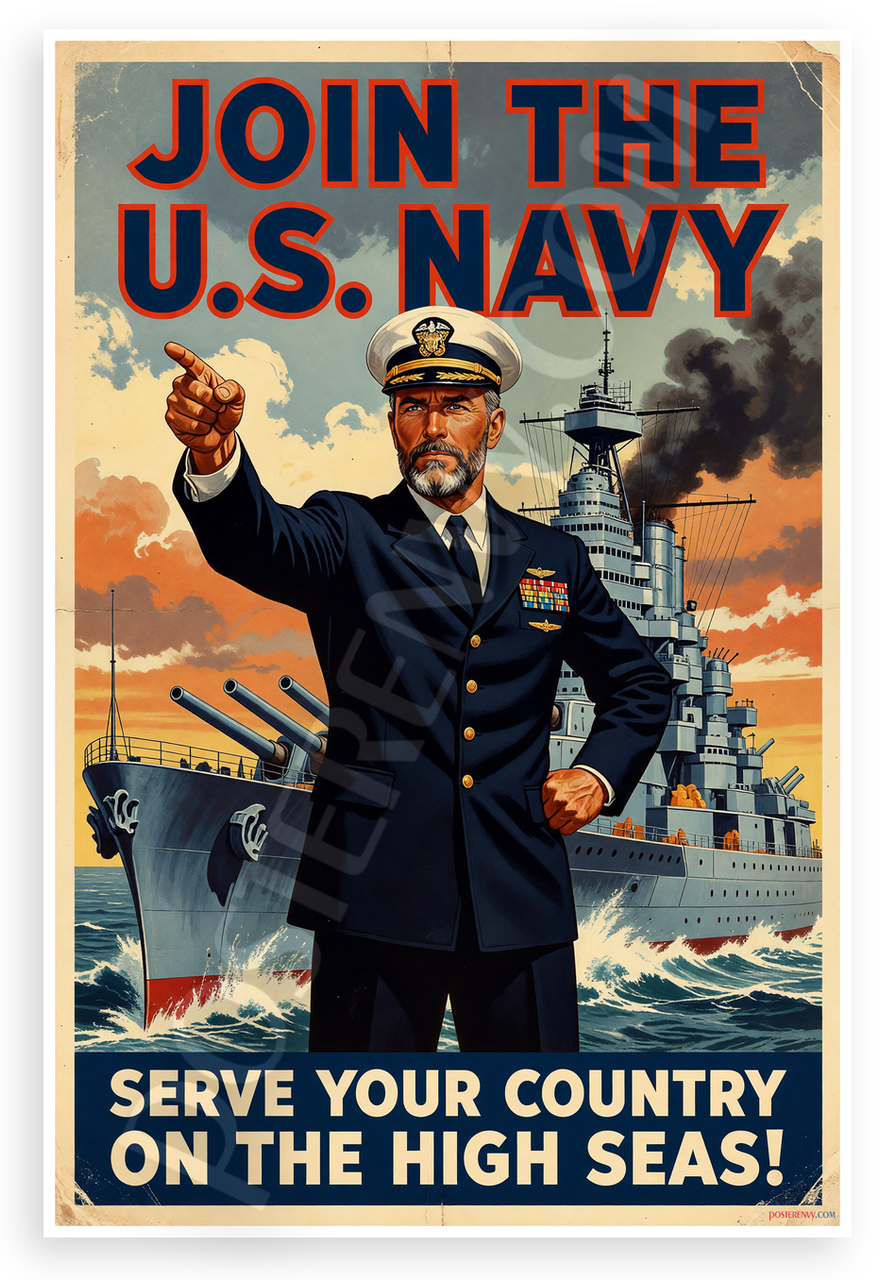 - Solar Powered Production: All our posters are designed and printed using solar energy, with crisp vivid artwork. Perfect for capturing WWII-era recruitment style, naval battleship imagery, resolute officer.