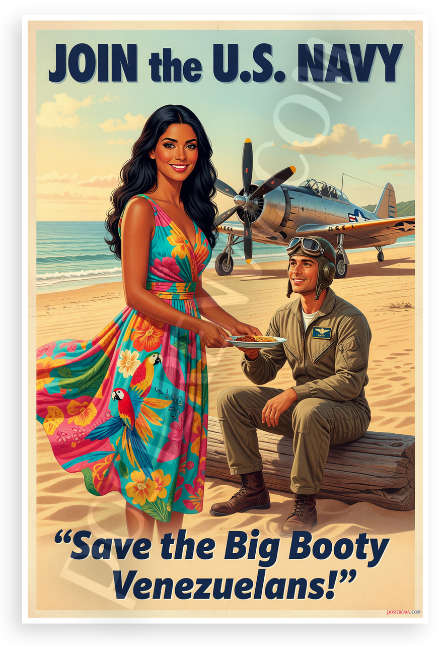 This 12x18 inch poster is printed on premium, durable paper. Proudly Made in the USA by PosterEnvy. The perfect size for any room. PosterEnvy is a family owned business, delivering top-notch posters around the world for over 20 years. Our posters are designed to last — they won't fade or pucker for years of enjoyment. Every poster features crisp, vivid artwork. We are a solar powered company. This humorous vintage WPA-style poster features a vibrant Venezuelan woman in a colorful floral dress serving food to a Navy airman beside a WWII fighter plane on a sunny beach, with playful text reading Join the U.S. Navy and Save the Big Booty Venezuelans.
