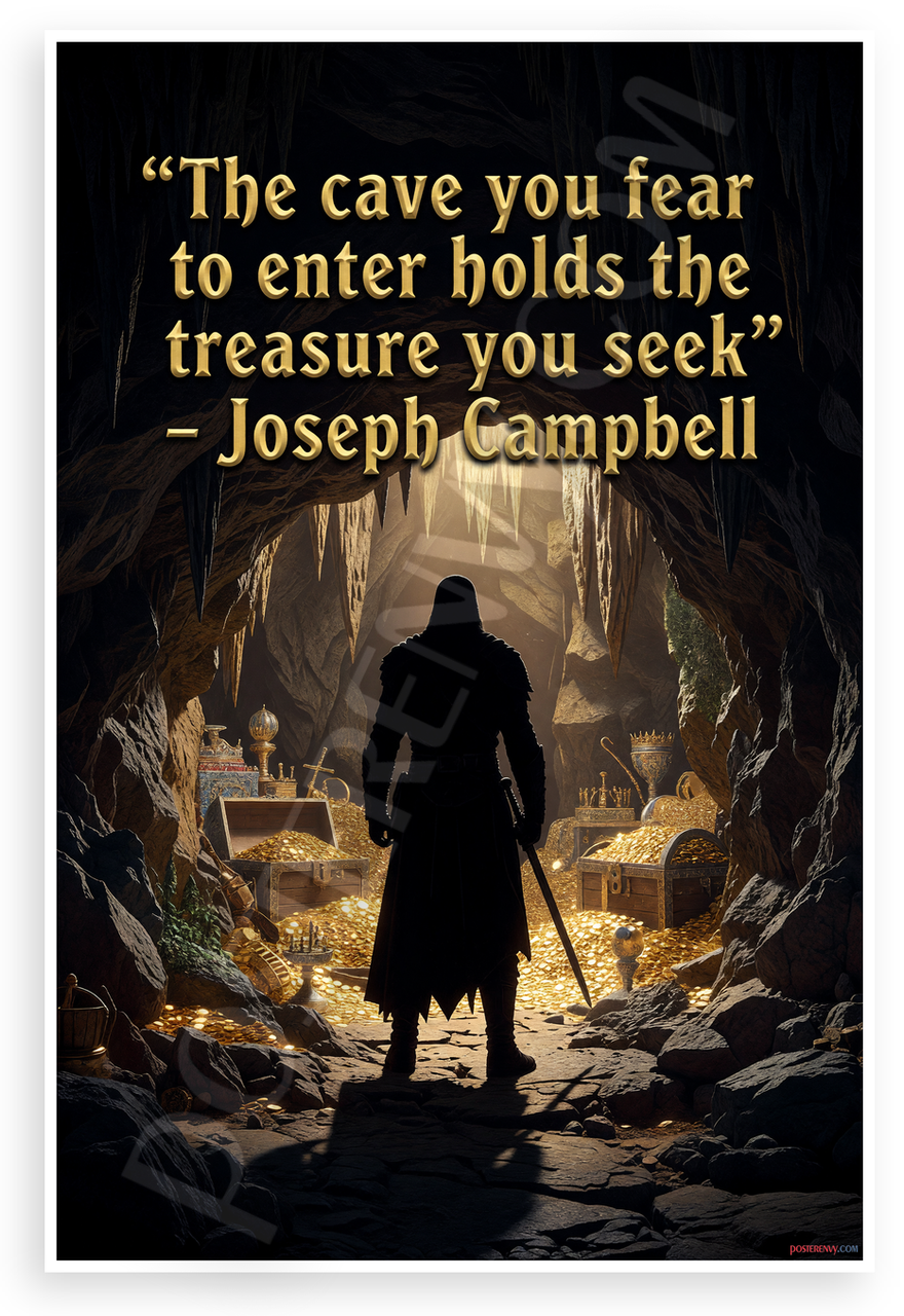 This 12x18 inch poster is printed on premium, durable paper. Proudly Made in the USA by PosterEnvy. The perfect size for any room. PosterEnvy is a family owned business, delivering top-notch posters around the world for over 20 years. Our posters are designed to last — they won't fade or pucker for years of enjoyment. Every poster features crisp, vivid artwork. We are a solar powered company. Featuring Joseph Campbell's powerful quote over a dramatic cave scene with a shadowy heroic warrior silhouette discovering glittering treasure chests of gold coins, swords, and jewels in an epic fantasy illustration style that evokes courage and adventure.
