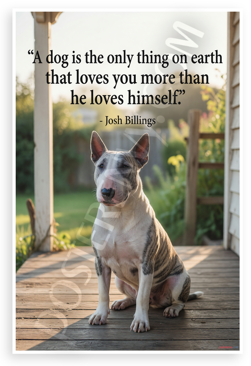 - Heartwarming Dog Portrait: Gentle Bull Terrier on sunny porch with Josh Billings quote on unconditional love. Warm, affectionate mood enhances any pet-themed space like living rooms or vet offices