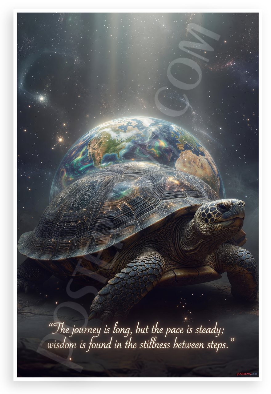 This 12x18 inch poster is printed on premium, durable paper. Proudly Made in the USA by PosterEnvy. The perfect size for any room. PosterEnvy is a family owned business, delivering top-notch posters around the world for over 20 years. Our posters are designed to last — they won't fade or pucker for years of enjoyment. Every poster features crisp, vivid artwork. We are a solar powered company. This mystical poster depicts a massive turtle bearing the glowing Earth on its back amid starry cosmos and ethereal light beams, paired with the profound quote: "The journey is long, but the pace is steady; wisdom is found in the stillness between steps." Ideal for evoking ancient wisdom and serenity.