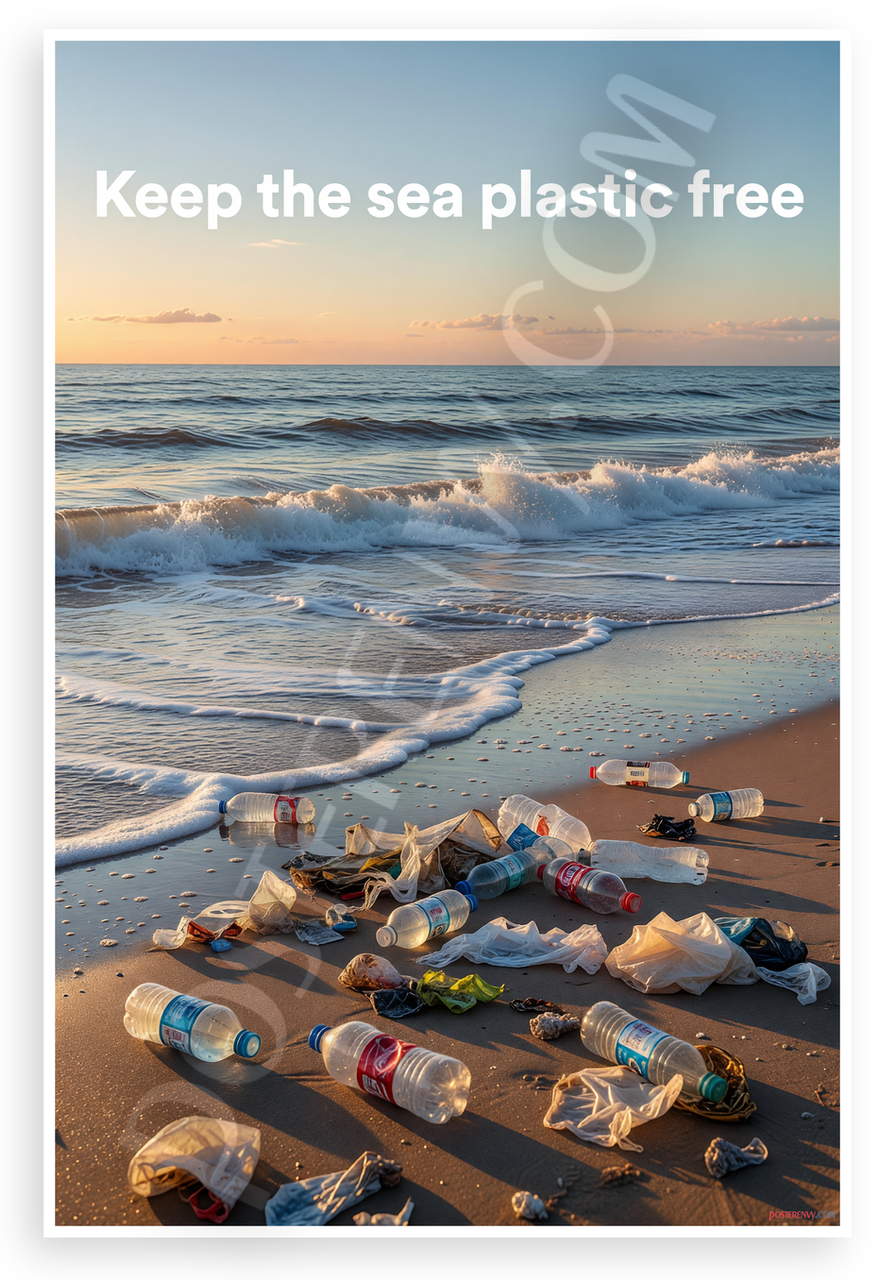 This 12x18 inch poster is printed on premium, durable paper. Proudly Made in the USA by PosterEnvy. The perfect size for any room. PosterEnvy is a family owned business, delivering top-notch posters around the world for over 20 years. Our posters are designed to last — they won't fade or pucker for years of enjoyment. Every poster features crisp, vivid artwork. We are a solar powered company. This striking image captures waves crashing on a littered beach with scattered plastic bottles and waste, paired with the bold message 'Keep the Sea Plastic Free' against a serene sunset ocean horizon, inspiring environmental action and reflection.