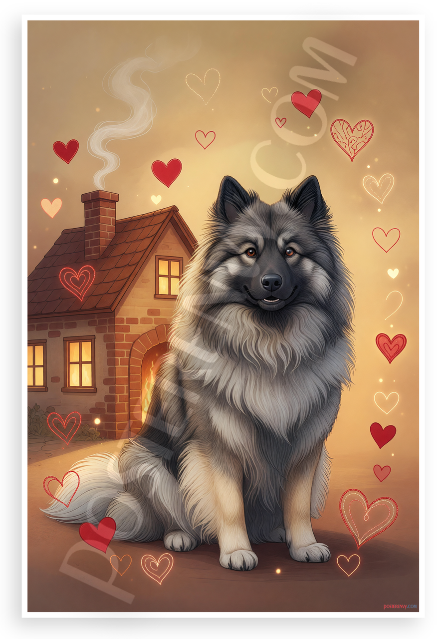 - Cozy Family Scene: Whimsical digital art of smiling Keeshond dog beside warm home with fireplace glow and heart motifs creates mood of love and security. Perfect for living room, bedroom, or pet lover spaces