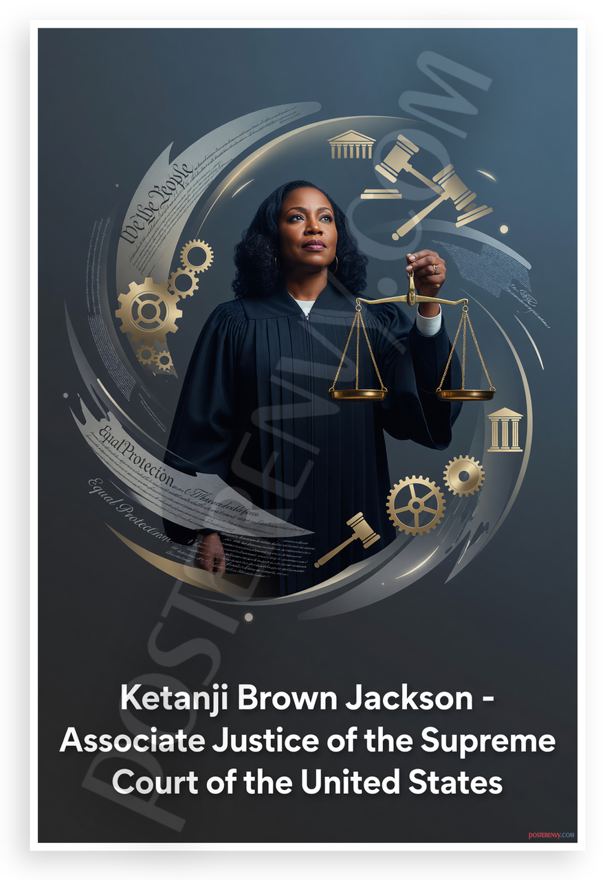 - Symbolic Legal Design: Dynamic portrait of Ketanji Brown Jackson in judicial robes holding golden scales, surrounded by gavel, Capitol, gears on navy blue background. Conveys equality, progress, determination; perfect for office, classroom, study