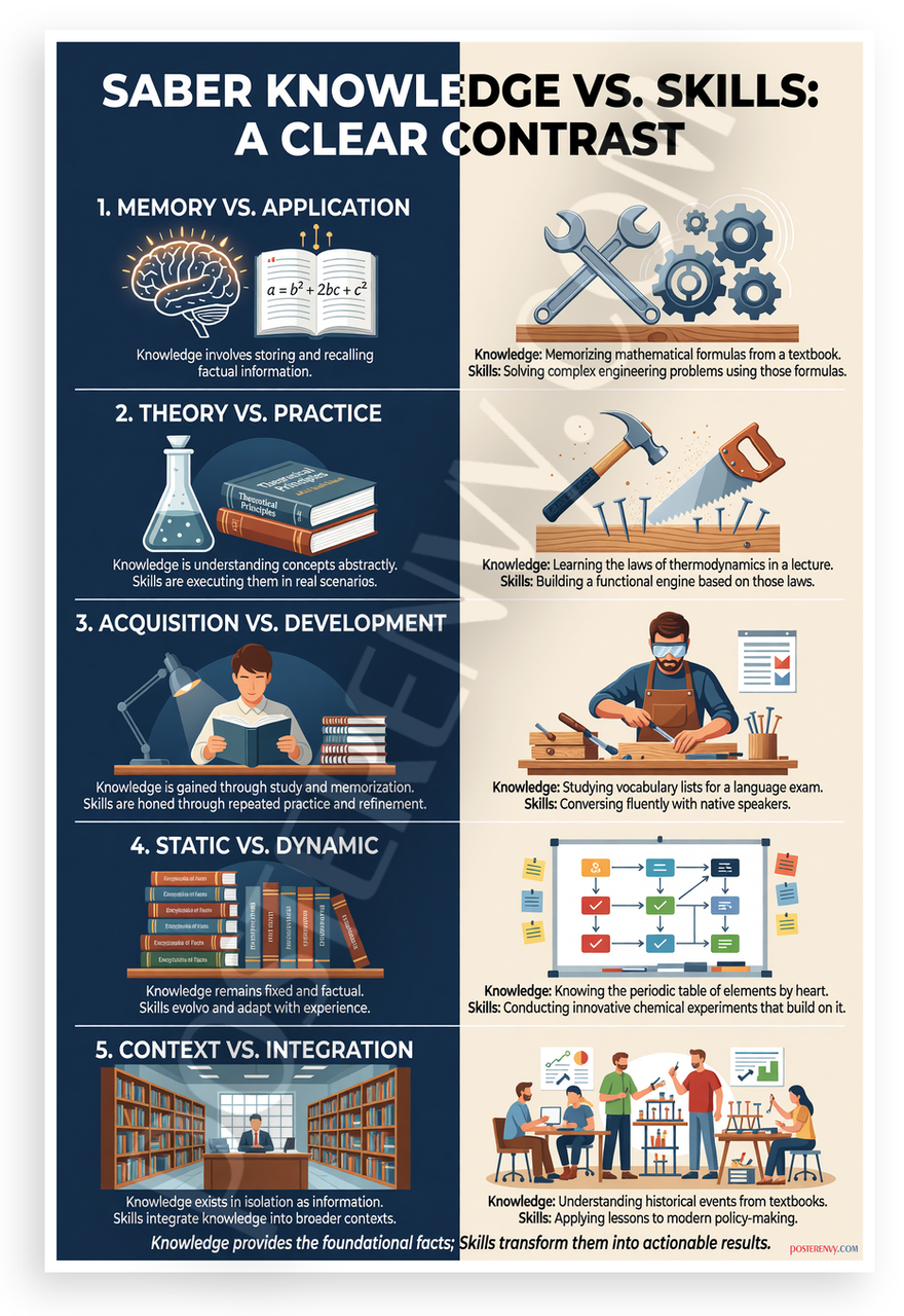 - Educational Contrasts Design: Bold infographic divides knowledge (books, studying) from skills (tools, building, experimenting) across 5 panels with real-world examples like thermodynamics engine and chemical labs. Motivates learning in classrooms, studies, or offices.