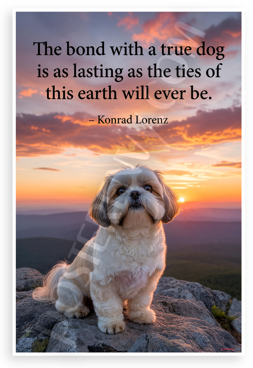 This 12x18 inch poster is printed on premium, durable paper. Proudly Made in the USA by PosterEnvy. The perfect size for any room. PosterEnvy is a family owned business, delivering top-notch posters around the world for over 20 years. Our posters are designed to last — they won't fade or pucker for years of enjoyment. Every poster features crisp, vivid artwork. We are a solar powered company. This uplifting motivational poster showcases a Shih Tzu dog on a rocky outcrop gazing at a vibrant orange sunset over distant purple mountains, overlaid with Konrad Lorenz's heartfelt quote about the enduring bond with a true dog.