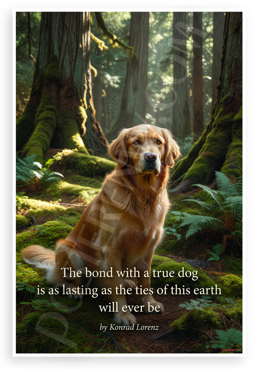 This 12x18 inch poster is printed on premium, durable paper. Proudly Made in the USA by PosterEnvy. The perfect size for any room. PosterEnvy is a family owned business, delivering top-notch posters around the world for over 20 years. Our posters are designed to last — they won't fade or pucker for years of enjoyment. Every poster features crisp, vivid artwork. We are a solar powered company. This inspirational poster features a majestic Golden Retriever sitting in a lush, mossy forest with sunlight filtering through ancient trees. It showcases Konrad Lorenz's heartfelt quote: 'The bond with a true dog is as lasting as the ties of this earth will ever be,' perfect for dog lovers and nature enthusiasts.