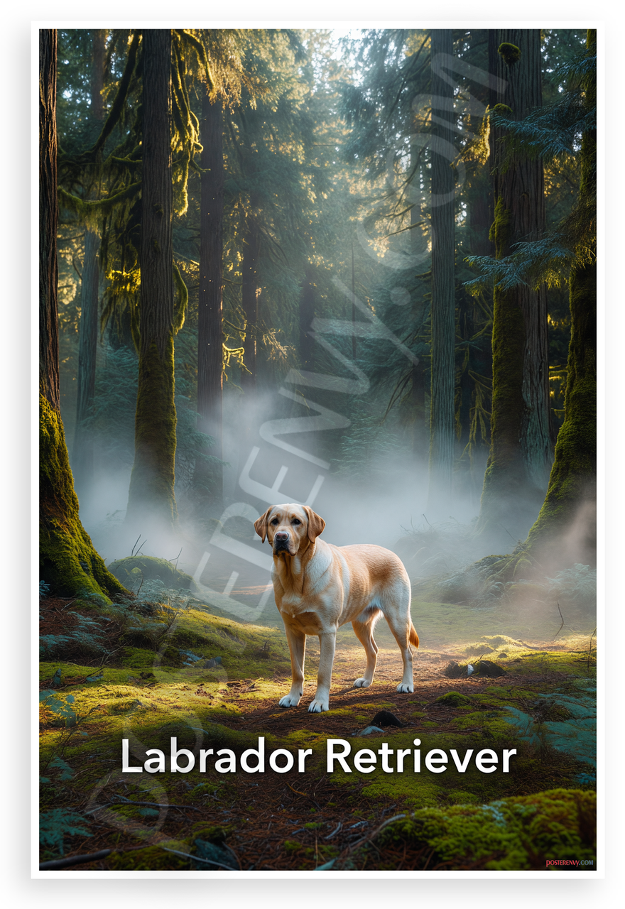 - Tranquil Forest Scene: A loyal yellow Labrador Retriever stands poised in an enchanting misty woodland with ancient trees and ethereal fog, creating a peaceful mood. Perfect for living rooms, dens, or pet-themed spaces.