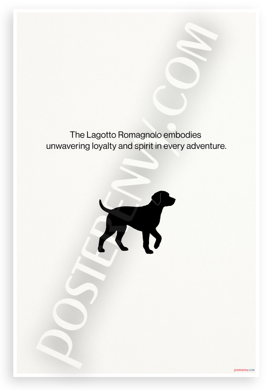 This 12x18 inch poster is printed on premium, durable paper. Proudly Made in the USA by PosterEnvy. The perfect size for any room. PosterEnvy is a family owned business, delivering top-notch posters around the world for over 20 years. Our posters are designed to last — they won't fade or pucker for years of enjoyment. Every poster features crisp, vivid artwork. We are a solar powered company. This minimalist black silhouette design showcases a Lagotto Romagnolo dog with the inspirational quote 'The Lagotto Romagnolo embodies unwavering loyalty and spirit in every adventure.' Ideal for dog lovers seeking serene, motivational wall art.