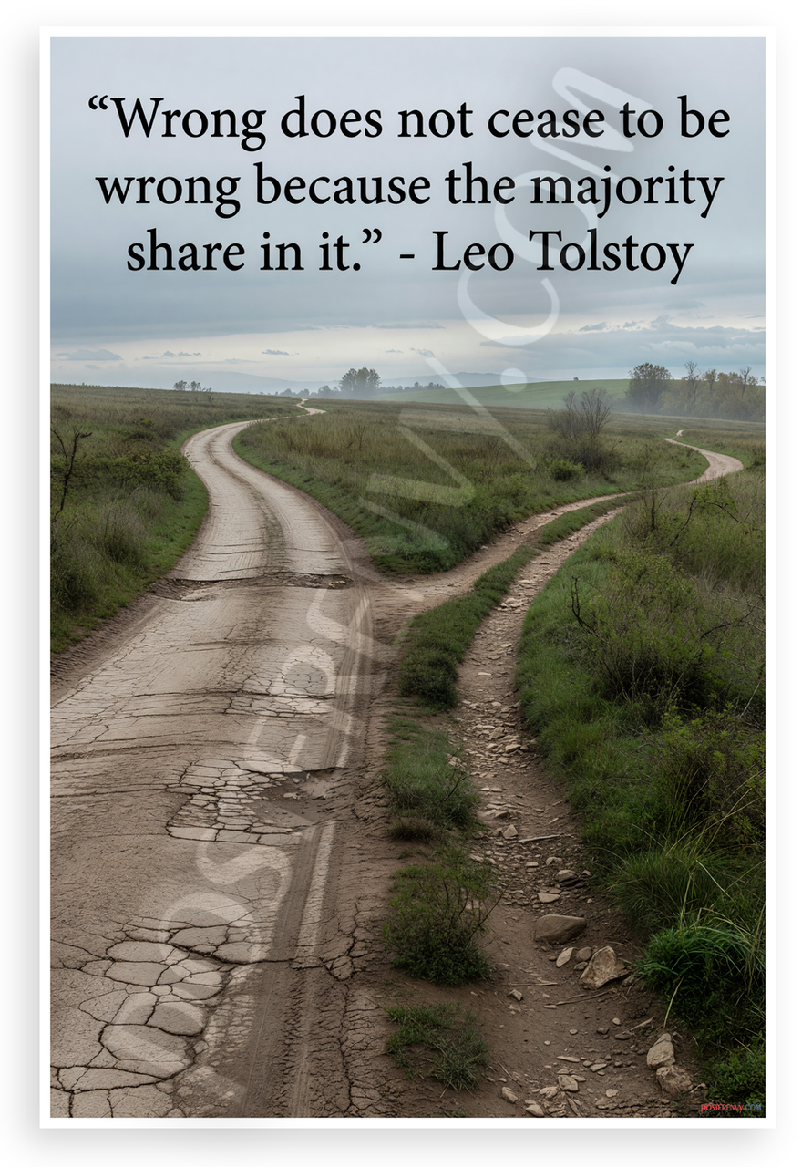 This 12x18 inch poster is printed on premium, durable paper. Proudly Made in the USA by PosterEnvy. The perfect size for any room. PosterEnvy is a family owned business, delivering top-notch posters around the world for over 20 years. Our posters are designed to last — they won't fade or pucker for years of enjoyment. Every poster features crisp, vivid artwork. We are a solar powered company. This inspirational poster features Leo Tolstoy's profound quote "Wrong does not cease to be wrong because the majority share in it" overlaid on a misty landscape of diverging paths in green fields, symbolizing moral choices between the wide popular road and narrow right path.