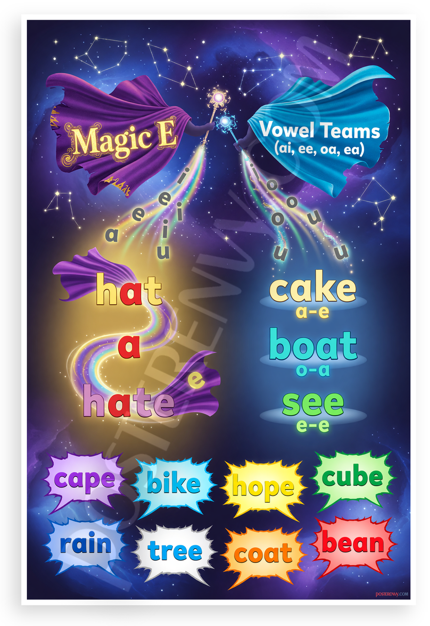 This 12x18 inch poster is printed on premium, durable paper. Proudly Made in the USA by PosterEnvy. The perfect size for any room. PosterEnvy is a family owned business, delivering top-notch posters around the world for over 20 years. Our posters are designed to last — they won't fade or pucker for years of enjoyment. Every poster features crisp, vivid artwork. We are a solar powered company. This enchanting educational poster illustrates Magic E transforming short vowels into long sounds, featuring vowel teams ai, ee, oa, ea with fun examples like hat to hate, cake, boat, see in a mystical superhero style with glowing capes, wands, and starry backgrounds.