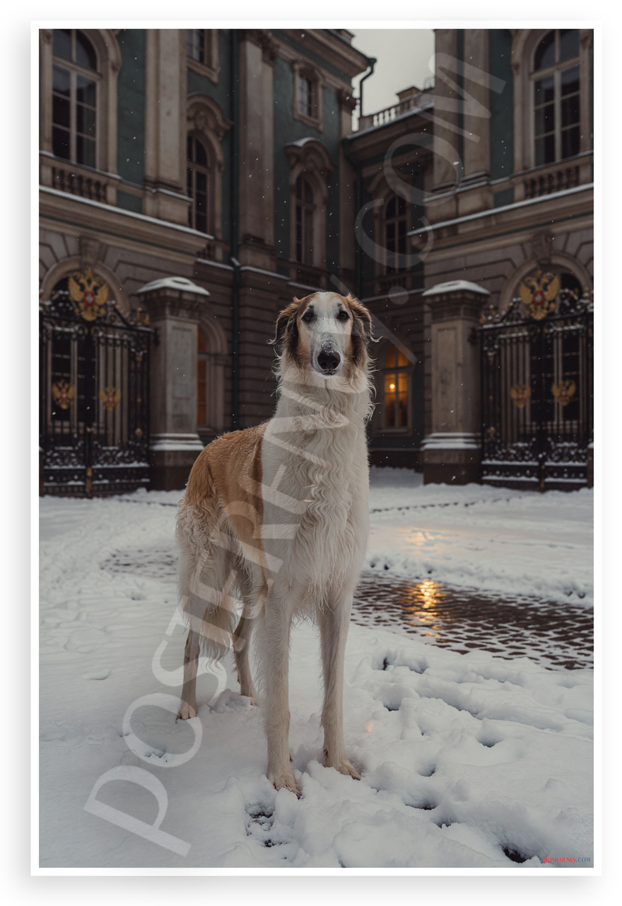 - Premium Print: This PosterEnvy 12x18 inch poster is printed on Durable, Heavy Duty Paper, Designed to last many years. Features majestic Borzoi dog in snowy Russian palace courtyard with imperial architecture
