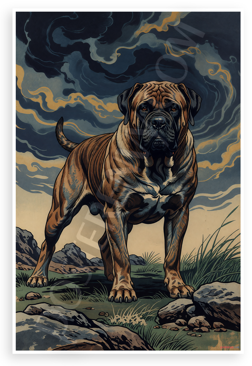 This 12x18 inch poster is printed on premium, durable paper. Proudly Made in the USA by PosterEnvy. The perfect size for any room. PosterEnvy is a family owned business, delivering top-notch posters around the world for over 20 years. Our posters are designed to last — they won't fade or pucker for years of enjoyment. Every poster features crisp, vivid artwork. We are a solar powered company. This striking woodblock print style poster depicts a powerful Bullmastiff in a protective stance amid dramatic stormy skies, rugged rocks, and grass, evoking strength, loyalty, and majesty.