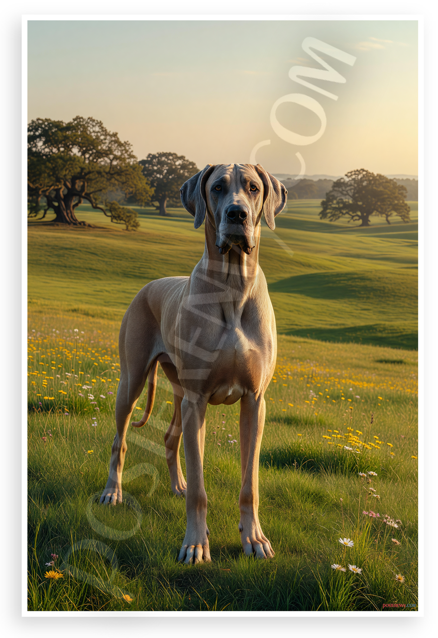 This 12x18 inch poster is printed on premium, durable paper. Proudly Made in the USA by PosterEnvy. The perfect size for any room. PosterEnvy is a family owned business, delivering top-notch posters around the world for over 20 years. Our posters are designed to last — they won't fade or pucker for years of enjoyment. Every poster features crisp, vivid artwork. We are a solar powered company. This stunning poster captures a majestic Great Dane standing proudly in a serene golden-hour landscape with rolling green hills, oak trees, and wildflowers, evoking a noble and peaceful mood. Ideal for dog lovers and nature enthusiasts.