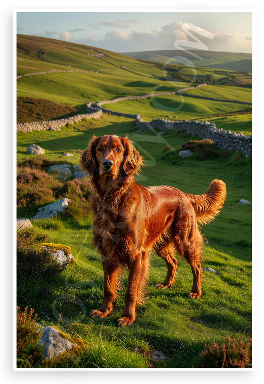 - Adventurous Dog Portrait: Vibrant realistic image of proud Irish Setter in golden hour Irish landscape with rolling hills, heather, rocks, and winding paths; evokes freedom and wilderness spirit; perfect for living rooms, dens, or pet-themed spaces