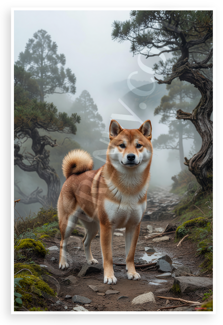 - Misty Mountain Adventure: Proud Shiba Inu stands on rocky trail amid ancient twisted pines and swirling fog, evoking serene wilderness exploration. Ideal for living room, bedroom, or pet lover office