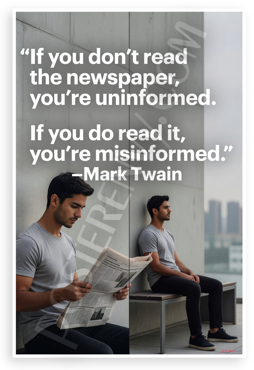 - Ironic Media Quote: Features Mark Twain's witty quote on newspapers and misinformation with split photo of man reading paper versus contemplative urban gaze, modern gray tones for offices or studies