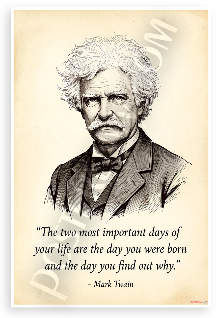 - Inspirational Portrait Design: Vintage sketch of Mark Twain in formal attire with his profound quote 'The two most important days of your life are the day you were born and the day you find out why.' Ideal for office, study, or living room to spark reflection and motivation.