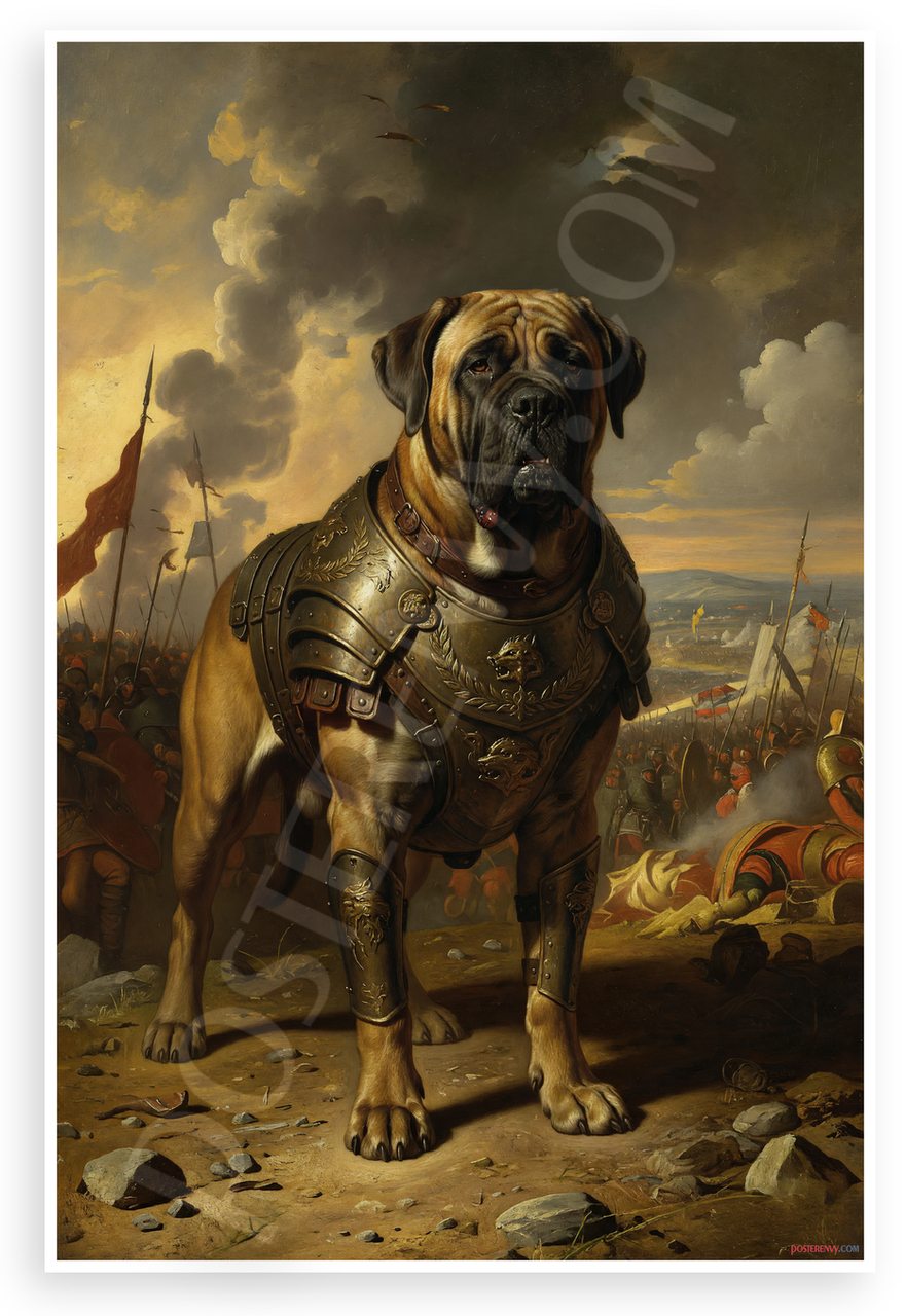 - Epic Battlefield Scene: Majestic Mastiff in ornate ancient armor stands heroically amid soldiers, flags, and chaos under dramatic cloudy skies. Perfect for man cave, game room, or office