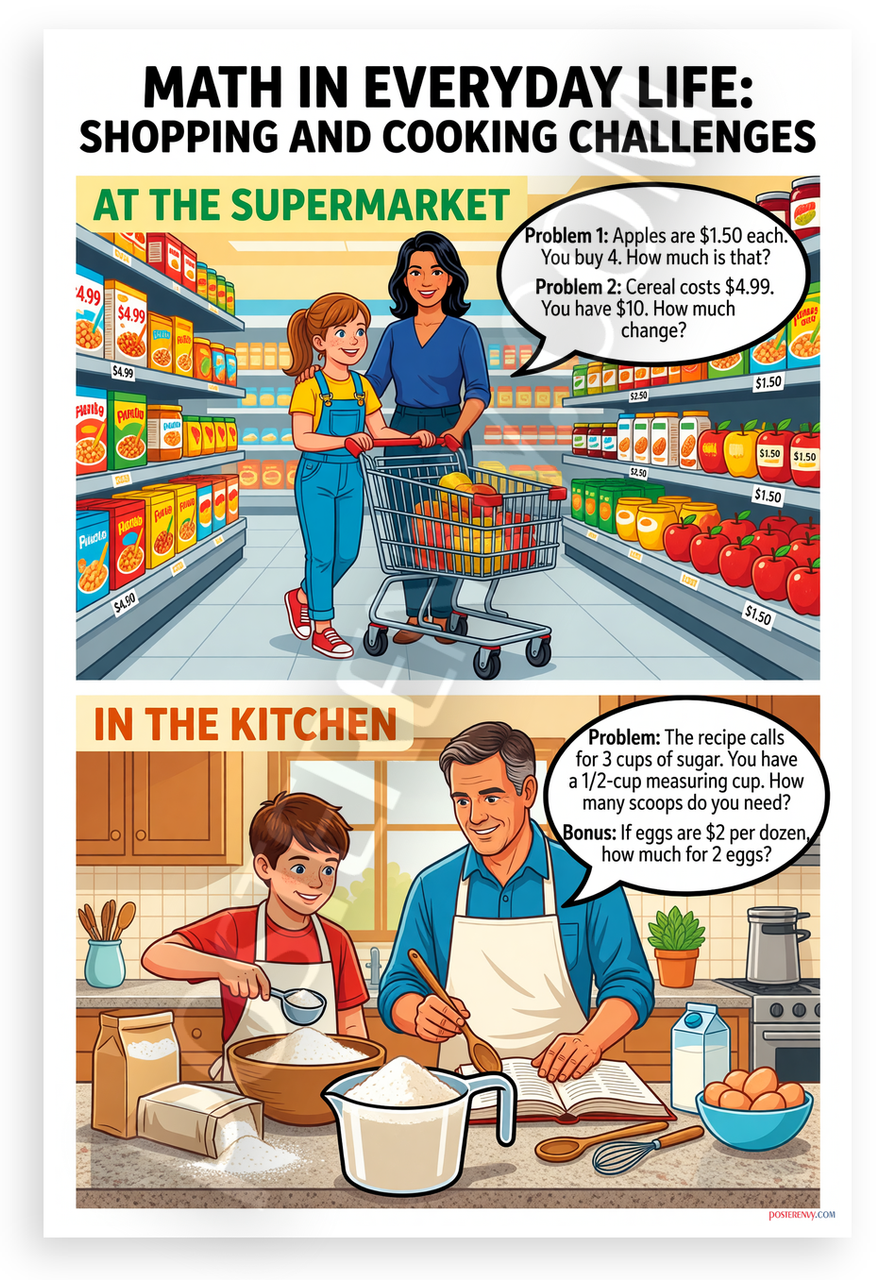 - Premium Print: This PosterEnvy 12x18 inch poster is printed on Durable, Heavy Duty Paper, Designed to last many years. Features colorful illustrations of supermarket shopping math problems and kitchen cooking challenges for young learners.