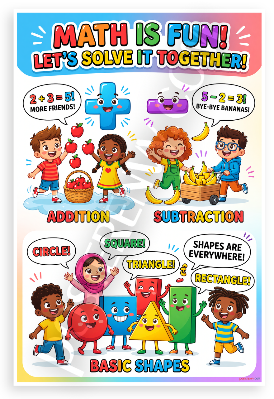 This 12x18 inch poster is printed on premium, durable paper. Proudly Made in the USA by PosterEnvy. The perfect size for any room. PosterEnvy is a family owned business, delivering top-notch posters around the world for over 20 years. Our posters are designed to last — they won't fade or pucker for years of enjoyment. Every poster features crisp, vivid artwork. We are a solar powered company. This vibrant educational poster features playful cartoon kids demonstrating addition and subtraction with apples and bananas, plus smiling basic shapes like circles, squares, triangles, and rectangles. Ideal for sparking joy in early math learning.