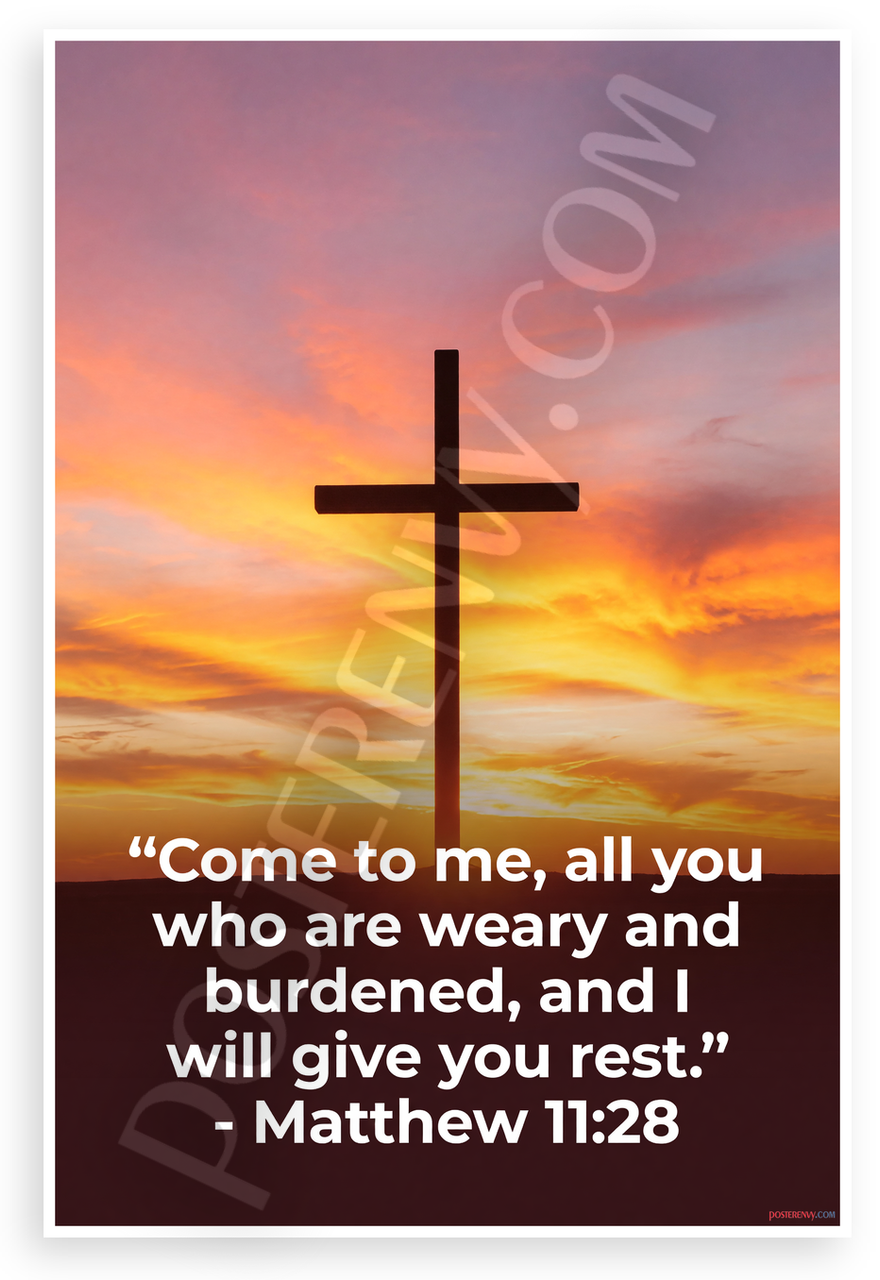 - Premium Print: This PosterEnvy 12x18 inch poster is printed on Durable, Heavy Duty Paper, Designed to last many years with a minimalist cross silhouette on sunset sky and Matthew 11:28 Bible quote