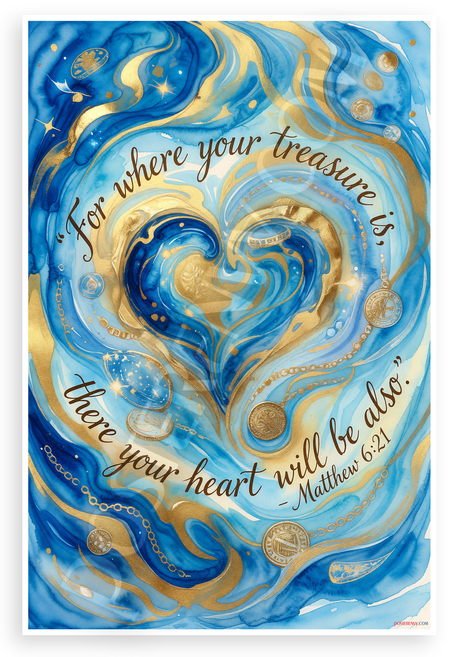 - Premium Print: This PosterEnvy 12x18 inch poster is printed on Durable, Heavy Duty Paper, Designed to last many years. Features Matthew 6:21 Bible quote with abstract blue gold watercolor heart treasure design