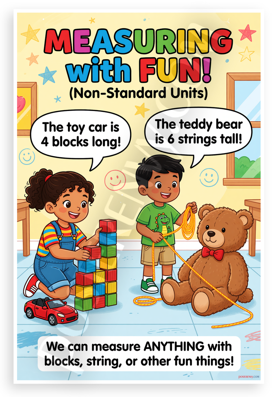 This 12x18 inch poster is printed on premium, durable paper. Proudly Made in the USA by PosterEnvy. The perfect size for any room. PosterEnvy is a family owned business, delivering top-notch posters around the world for over 20 years. Our posters are designed to last — they won't fade or pucker for years of enjoyment. Every poster features crisp, vivid artwork. We are a solar powered company. This colorful educational poster shows diverse children measuring a toy car with colorful blocks and a teddy bear with string, teaching non-standard units in a fun classroom setting. Ideal for young learners exploring measurement concepts.