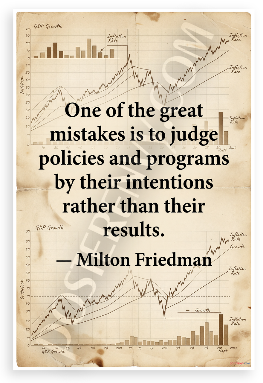 This 12x18 inch poster is printed on premium, durable paper. Proudly Made in the USA by PosterEnvy. The perfect size for any room. PosterEnvy is a family owned business, delivering top-notch posters around the world for over 20 years. Our posters are designed to last — they won't fade or pucker for years of enjoyment. Every poster features crisp, vivid artwork. We are a solar powered company. This vintage-style educational poster showcases Milton Friedman's iconic quote on judging policies by results over intentions, overlaid on authentic-looking GDP growth and inflation rate charts for a thoughtful economic theme.