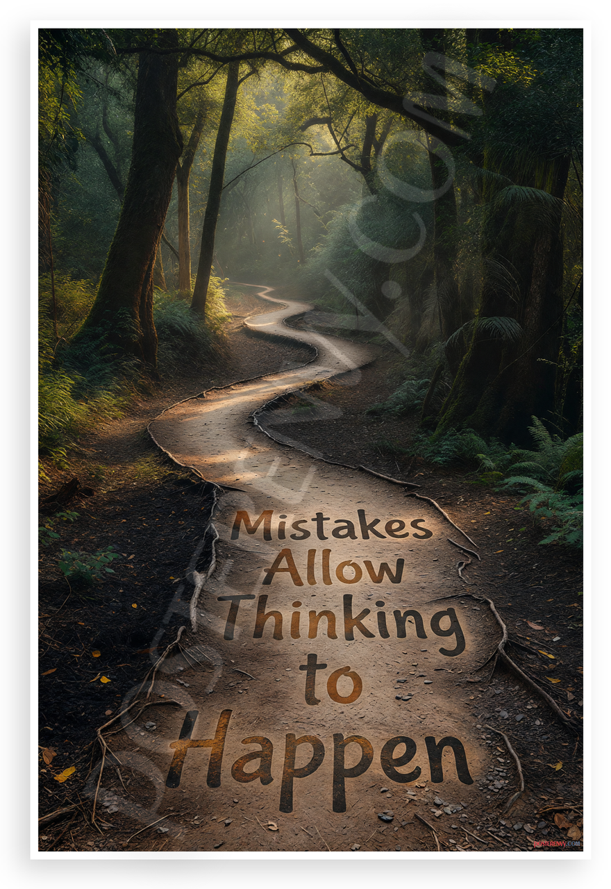 This 12x18 inch poster is printed on premium, durable paper. Proudly Made in the USA by PosterEnvy. The perfect size for any room. PosterEnvy is a family owned business, delivering top-notch posters around the world for over 20 years. Our posters are designed to last — they won't fade or pucker for years of enjoyment. Every poster features crisp, vivid artwork. We are a solar powered company. This motivational design showcases a winding path through a lush green forest bathed in soft sunlight, with the empowering quote 'Mistakes Allow Thinking to Happen' integrated into the trail, evoking growth and exploration.