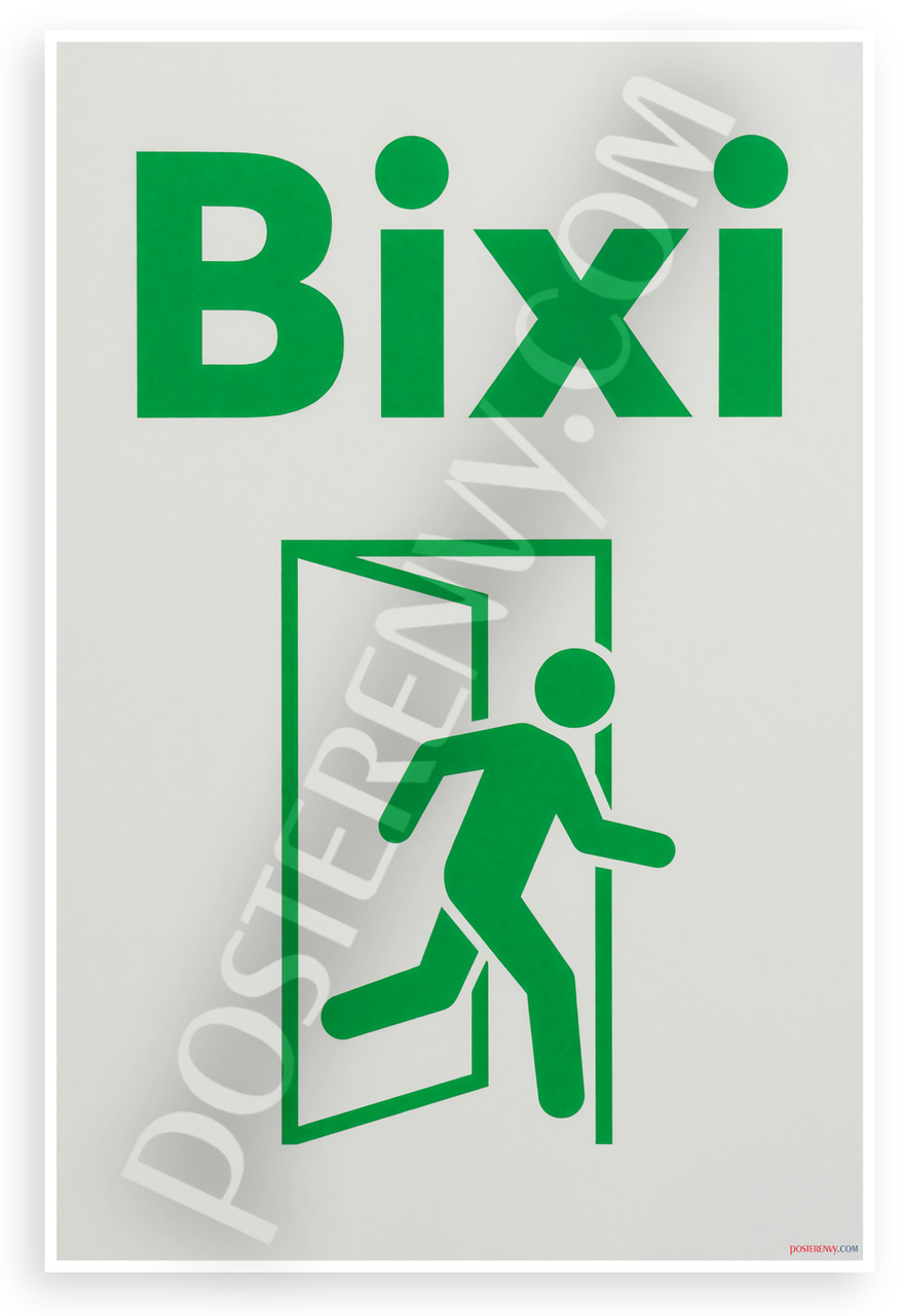 This 12x18 inch poster is printed on premium, durable paper. Proudly Made in the USA by PosterEnvy. The perfect size for any room. PosterEnvy is a family owned business, delivering top-notch posters around the world for over 20 years. Our posters are designed to last — they won't fade or pucker for years of enjoyment. Every poster features crisp, vivid artwork. We are a solar powered company. This modern minimalist design features bold green Bixi text, open door, and running figure symbol for clear emergency evacuation guidance. Ideal for safety-focused spaces with urgent, simple aesthetic.