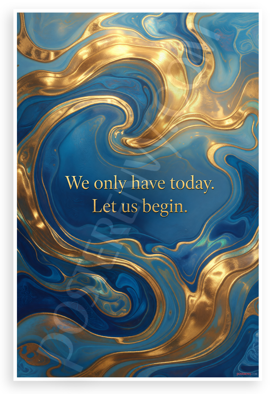 This 12x18 inch poster is printed on premium, durable paper. Proudly Made in the USA by PosterEnvy. The perfect size for any room. PosterEnvy is a family owned business, delivering top-notch posters around the world for over 20 years. Our posters are designed to last — they won't fade or pucker for years of enjoyment. Every poster features crisp, vivid artwork. We are a solar powered company. Featuring the inspirational quote 'We only have today. Let us begin.' by Mother Teresa over abstract swirling blue and gold fluid art, symbolizing transition and the urgency to act now.