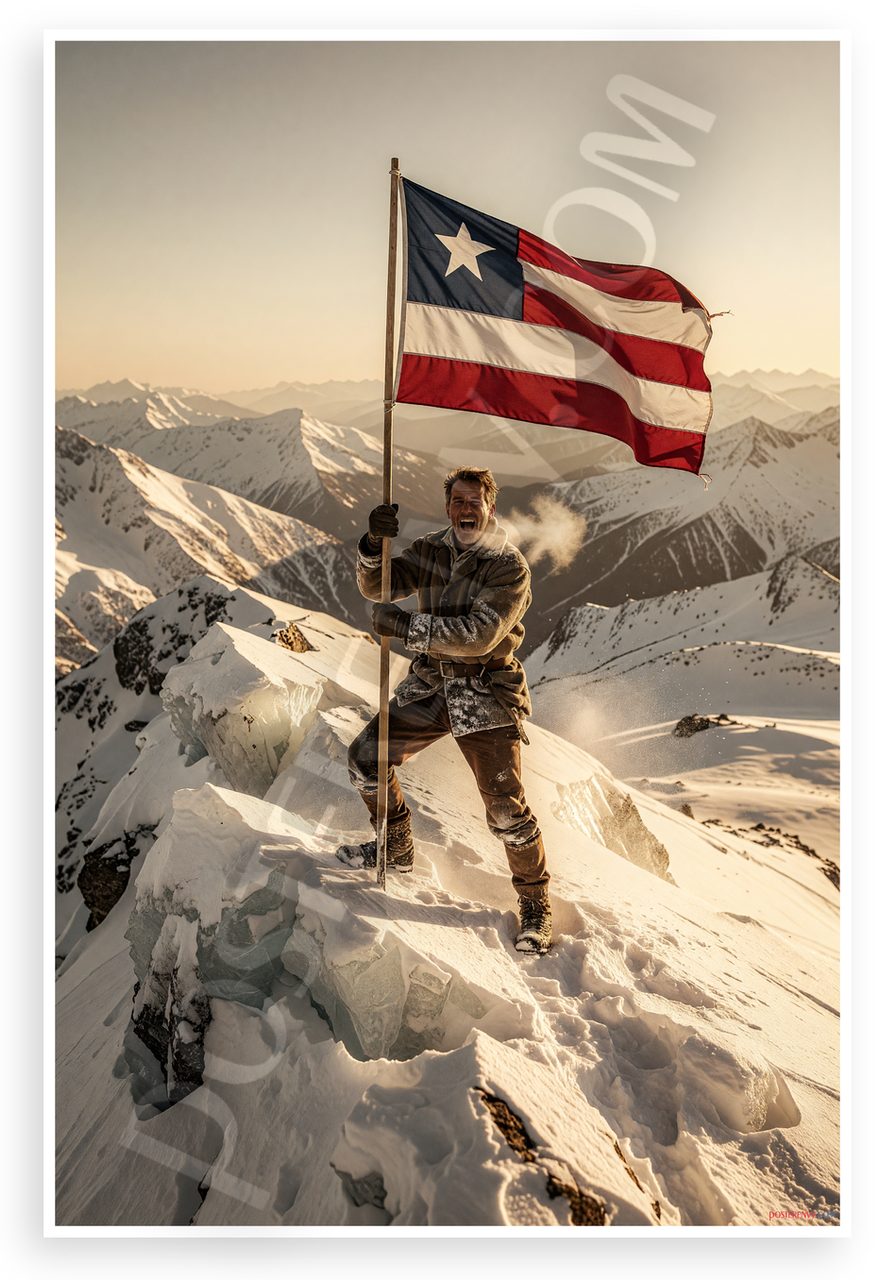 - Epic Summit Victory: Dramatic scene of mountaineer on snow-capped peak with flag, warm golden tones against icy blues, conveying triumph and resilience. Ideal for office, gym or man cave.