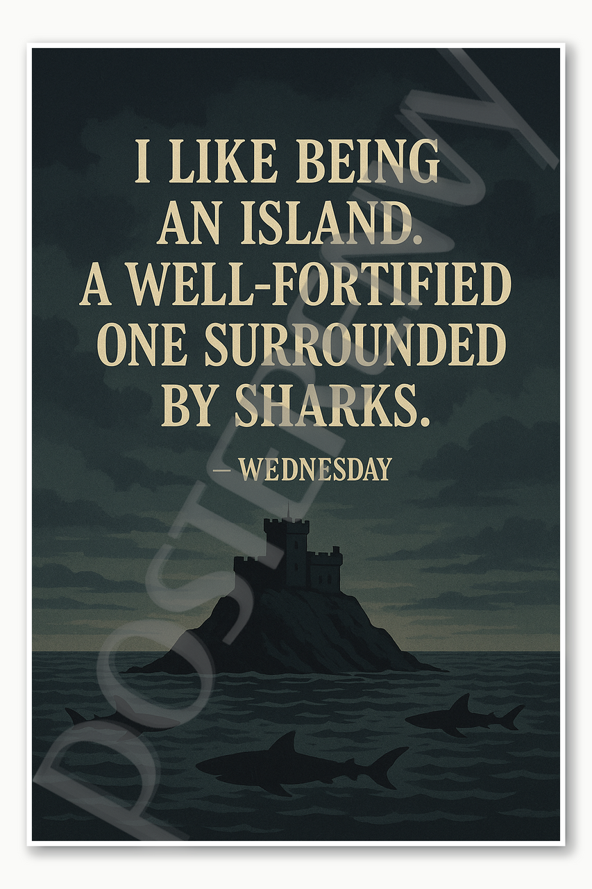 Click the button below to add the I like being an island A well-fortified one surrounded by sharks — Wednesday Poster - 18 inch x 12 inch to your wish list.