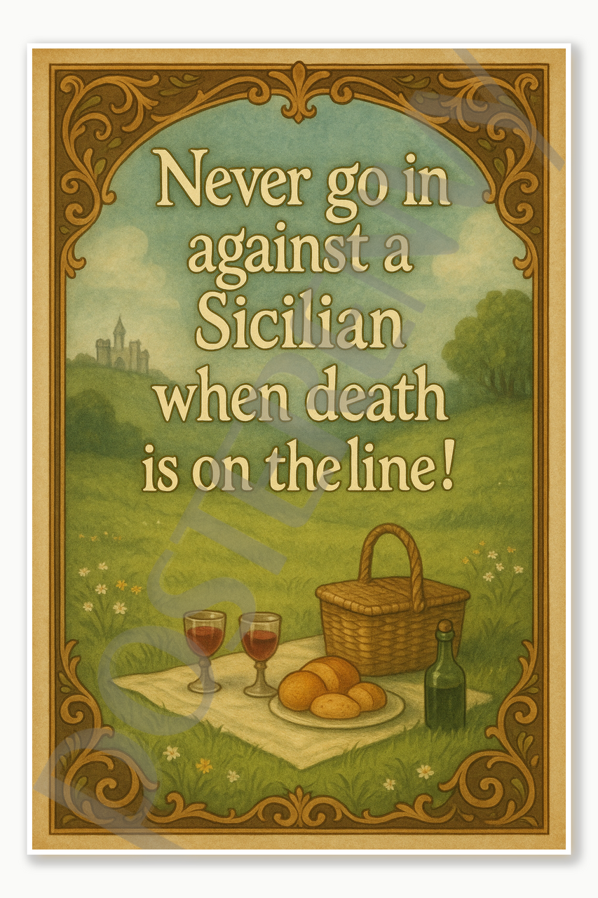 Click the button below to add the Never go in against a Sicilian when death is on the line! Poster - 18 inch x 12 inch to your wish list.
