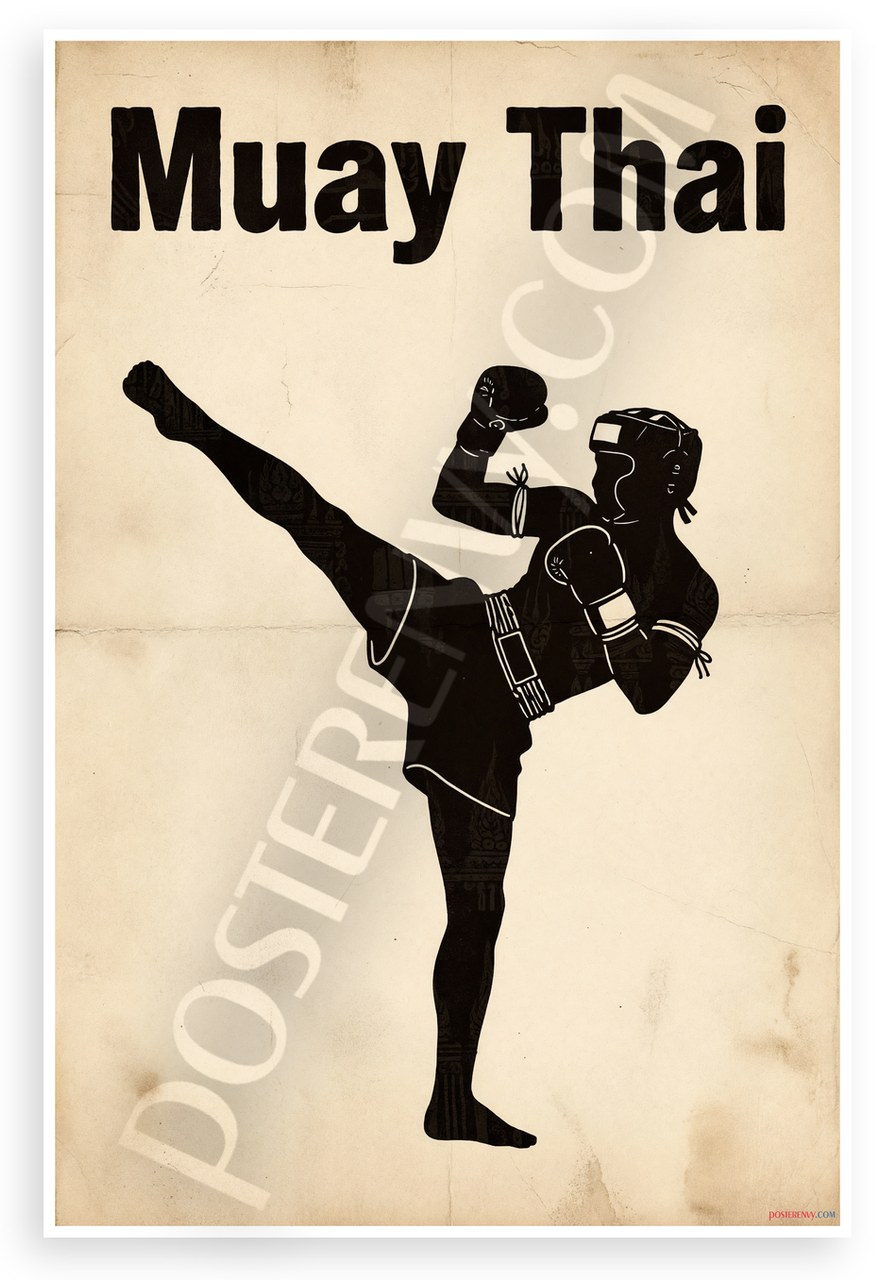 This 12x18 inch poster is printed on premium, durable paper. Proudly Made in the USA by PosterEnvy. The perfect size for any room. PosterEnvy is a family owned business, delivering top-notch posters around the world for over 20 years. Our posters are designed to last — they won't fade or pucker for years of enjoyment. Every poster features crisp, vivid artwork. We are a solar powered company. This vintage-style poster showcases a dynamic black silhouette of a Muay Thai fighter mid-kick, wearing headgear and gloves, with bold 'Muay Thai' text at the top on a distressed beige background, evoking tradition and power.