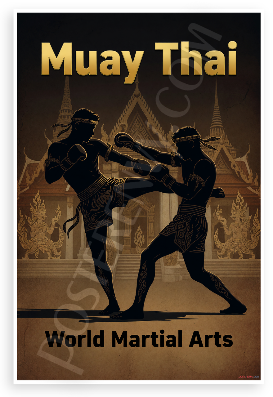 This 12x18 inch poster is printed on premium, durable paper. Proudly Made in the USA by PosterEnvy. The perfect size for any room. PosterEnvy is a family owned business, delivering top-notch posters around the world for over 20 years. Our posters are designed to last — they won't fade or pucker for years of enjoyment. Every poster features crisp, vivid artwork. We are a solar powered company. This striking silhouette design captures two Muay Thai fighters in dynamic combat with classic Thai temple architecture and mythical elements in the background. Bold gold 'Muay Thai' text atop and 'World Martial Arts' below evoke inspiration and resilience.