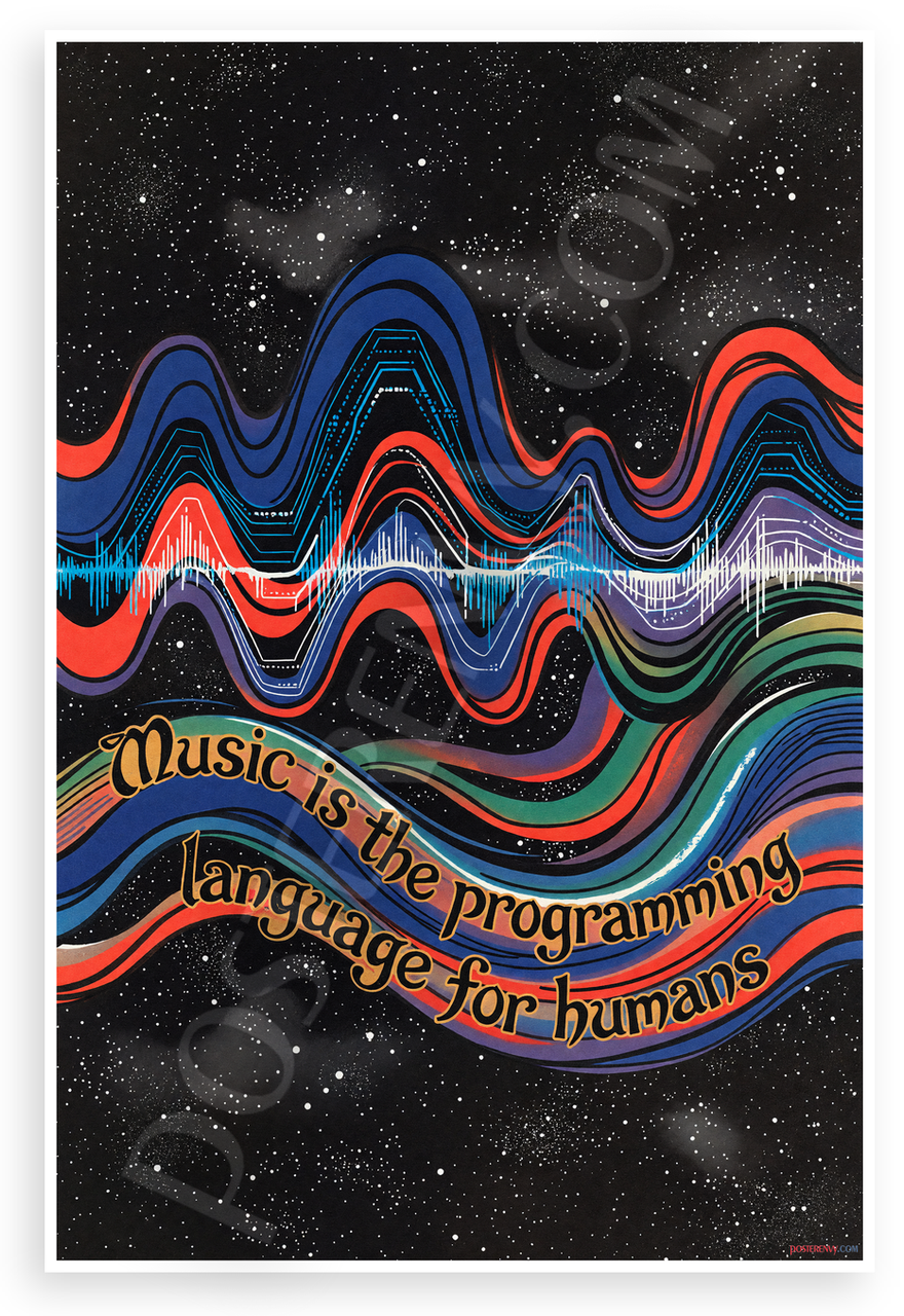 This 12x18 inch poster is printed on premium, durable paper. Proudly Made in the USA by PosterEnvy. The perfect size for any room. PosterEnvy is a family owned business, delivering top-notch posters around the world for over 20 years. Our posters are designed to last — they won't fade or pucker for years of enjoyment. Every poster features crisp, vivid artwork. We are a solar powered company. This abstract woodblock print style poster blends swirling sound waves and data streams in vibrant blues, reds, and purples against a cosmic starry background, with the inspirational quote 'Music is the programming language for humans'. Ideal for music lovers, coders, and creative spaces.