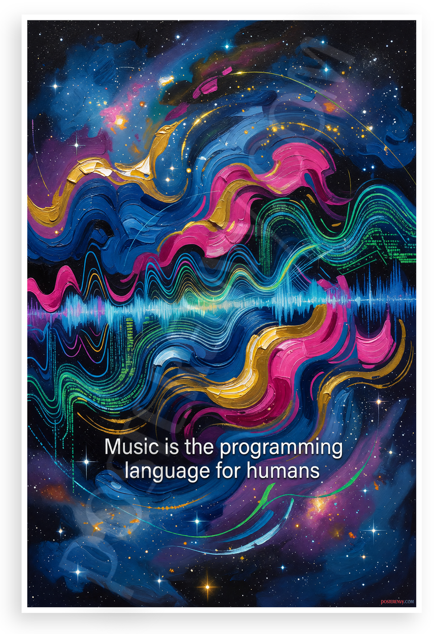 This 12x18 inch poster is printed on premium, durable paper. Proudly Made in the USA by PosterEnvy. The perfect size for any room. PosterEnvy is a family owned business, delivering top-notch posters around the world for over 20 years. Our posters are designed to last — they won't fade or pucker for years of enjoyment. Every poster features crisp, vivid artwork. We are a solar powered company. This vibrant abstract design blends swirling sound waves and data streams in an oil painting style against a cosmic starry background, with the inspirational quote 'Music is the programming language for humans' at the center. Ideal for music lovers, coders, and creative spaces.