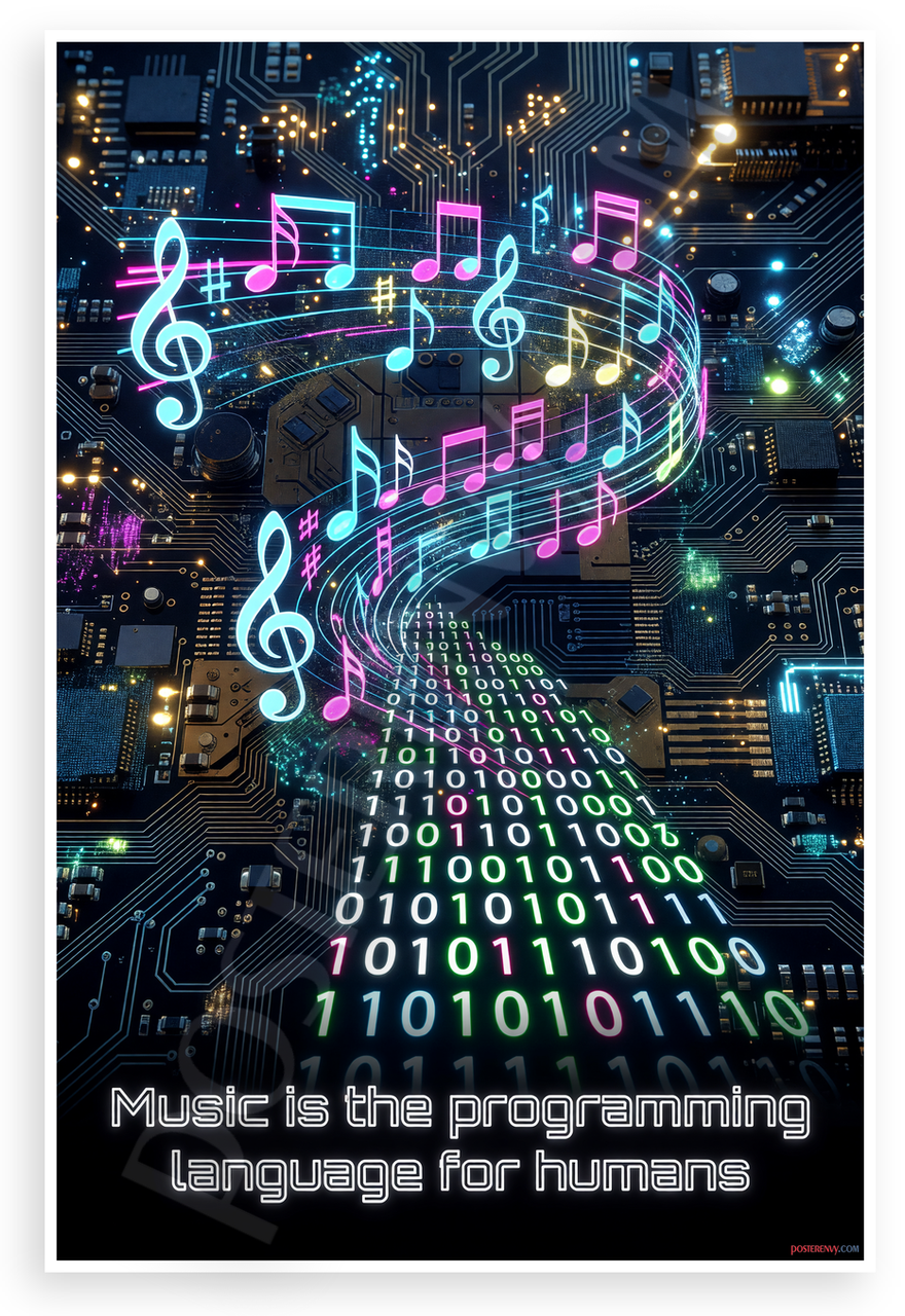 This 12x18 inch poster is printed on premium, durable paper. Proudly Made in the USA by PosterEnvy. The perfect size for any room. PosterEnvy is a family owned business, delivering top-notch posters around the world for over 20 years. Our posters are designed to last — they won't fade or pucker for years of enjoyment. Every poster features crisp, vivid artwork. We are a solar powered company. This vibrant design fuses glowing musical notes and binary code over a futuristic circuit board background, with the inspirational quote 'Music is the programming language for humans'. Ideal for music lovers, coders, and tech enthusiasts.