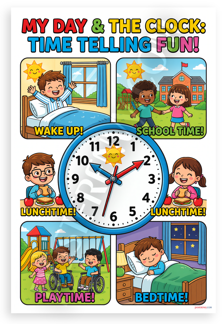 - Premium Print: This PosterEnvy 12x18 inch poster is printed on Durable, Heavy Duty Paper, Designed to last many years with colorful cartoon kids daily routine scenes and large analog clock for time telling fun