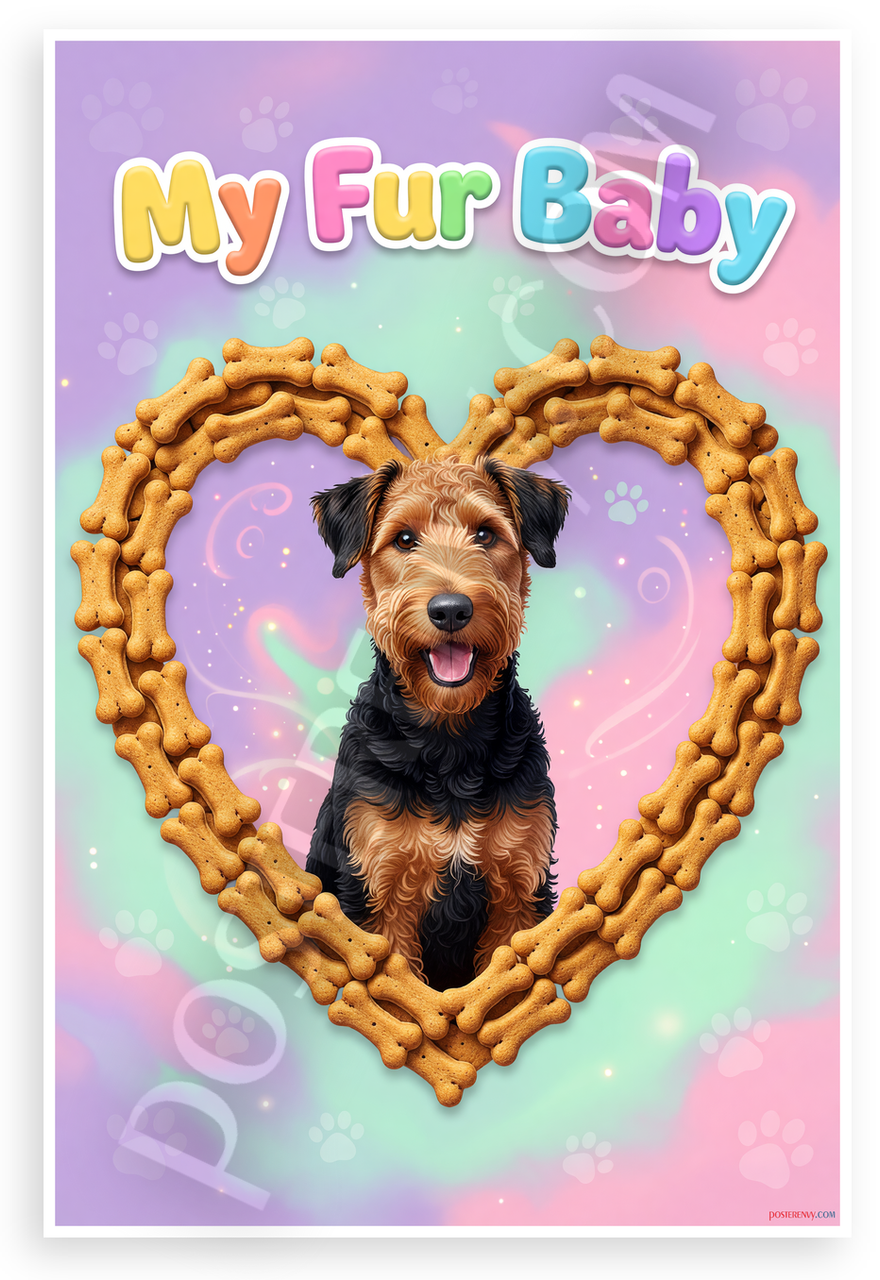 This 12x18 inch poster is printed on premium, durable paper. Proudly Made in the USA by PosterEnvy. The perfect size for any room. PosterEnvy is a family owned business, delivering top-notch posters around the world for over 20 years. Our posters are designed to last — they won't fade or pucker for years of enjoyment. Every poster features crisp, vivid artwork. We are a solar powered company. This whimsical poster showcases an adorable Airedale Terrier framed in a heart of colorful dog bone treats, with playful 'My Fur Baby' text atop a vibrant purple and pastel background, perfect for pet lovers' spaces.