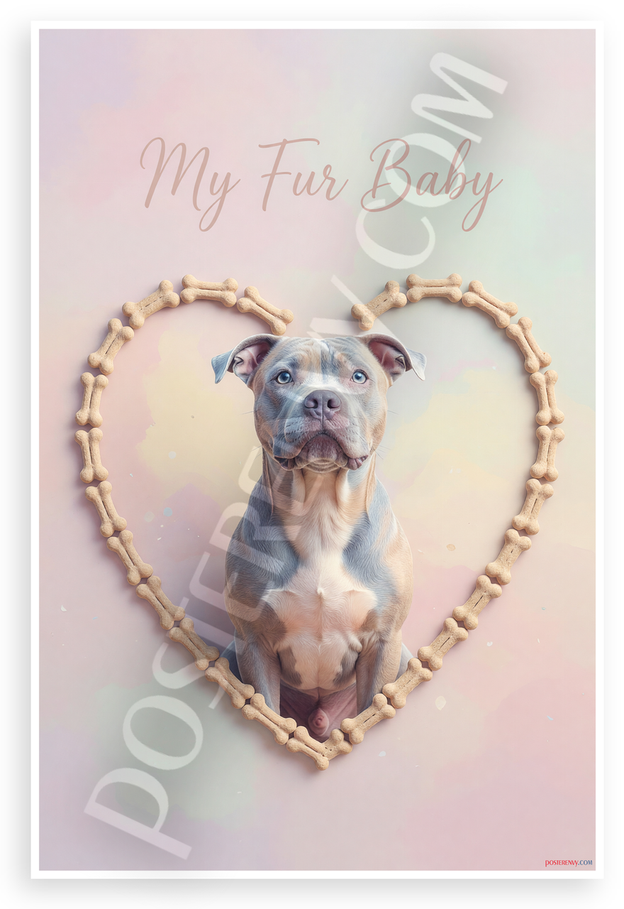 This 12x18 inch poster is printed on premium, durable paper. Proudly Made in the USA by PosterEnvy. The perfect size for any room. PosterEnvy is a family owned business, delivering top-notch posters around the world for over 20 years. Our posters are designed to last — they won't fade or pucker for years of enjoyment. Every poster features crisp, vivid artwork. We are a solar powered company. This heartwarming design showcases an American Staffordshire Terrier centered in a heart frame of dog bone treats, with 'My Fur Baby' text in soft pastel pinks, blues, and yellows for a serene pet tribute. Ideal for dog lovers' homes.