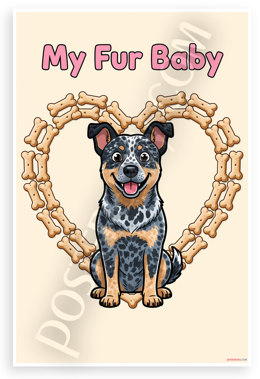 This 12x18 inch poster is printed on premium, durable paper. Proudly Made in the USA by PosterEnvy. The perfect size for any room. PosterEnvy is a family owned business, delivering top-notch posters around the world for over 20 years. Our posters are designed to last — they won't fade or pucker for years of enjoyment. Every poster features crisp, vivid artwork. We are a solar powered company. This whimsical cartoon poster features an adorable Australian Cattle Dog sitting inside a heart-shaped frame of tiny dog bone treats, topped with playful 'My Fur Baby' text in pink. Perfect for dog lovers and pet-themed decor.