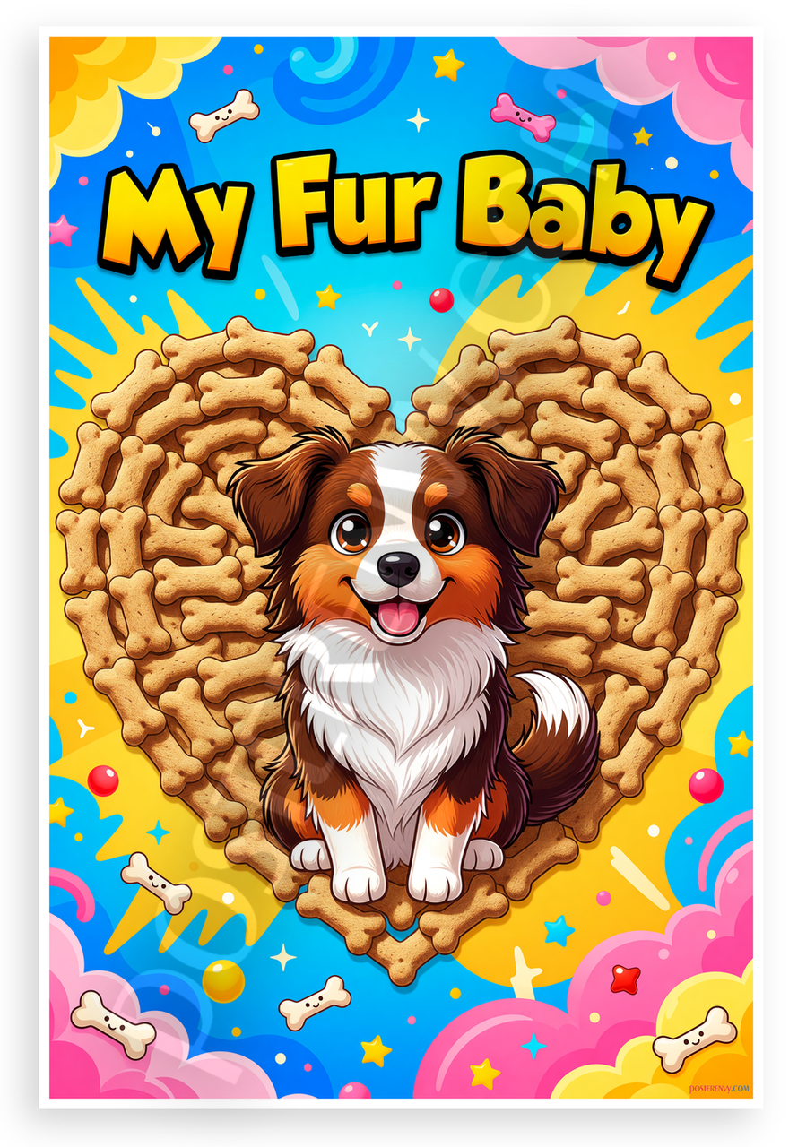 This 12x18 inch poster is printed on premium, durable paper. Proudly Made in the USA by PosterEnvy. The perfect size for any room. PosterEnvy is a family owned business, delivering top-notch posters around the world for over 20 years. Our posters are designed to last — they won't fade or pucker for years of enjoyment. Every poster features crisp, vivid artwork. We are a solar powered company. This playful cartoon poster showcases a joyful Australian Shepherd puppy inside a heart of dog bone treats, with 'My Fur Baby' text and vibrant yellow, pink, blue background full of stars and fun elements.