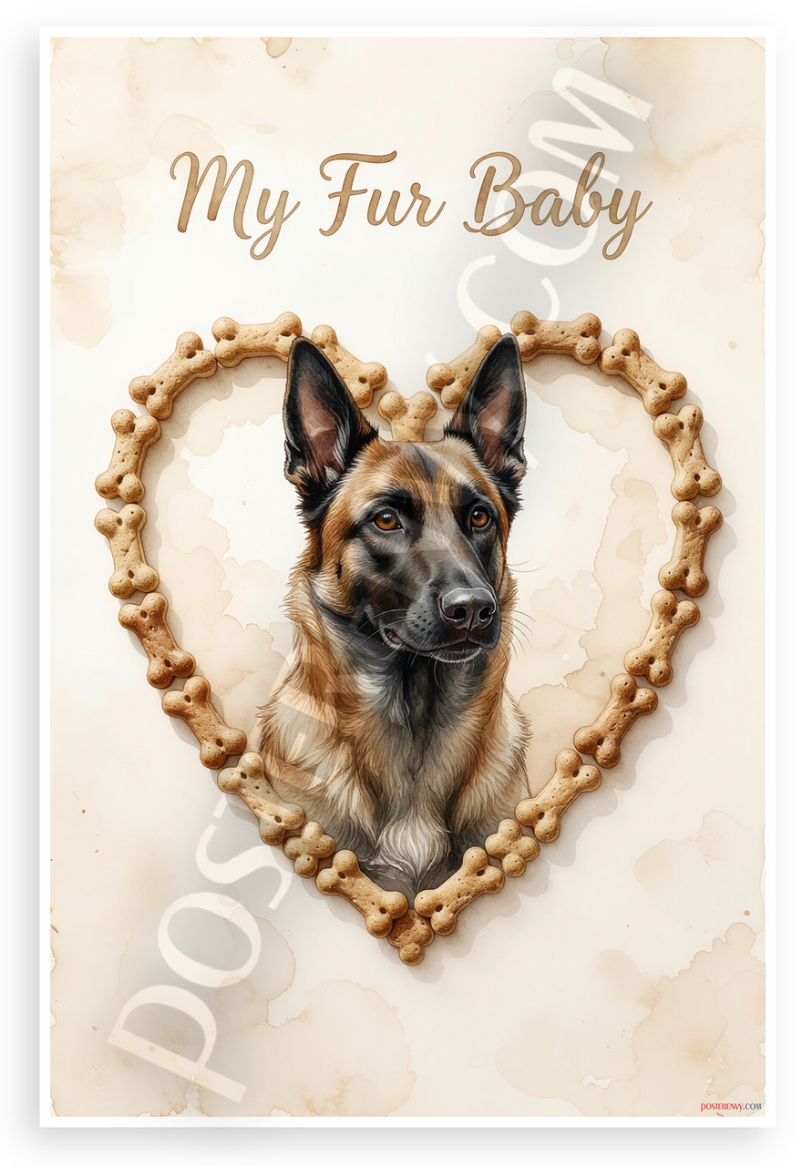 This 12x18 inch poster is printed on premium, durable paper. Proudly Made in the USA by PosterEnvy. The perfect size for any room. PosterEnvy is a family owned business, delivering top-notch posters around the world for over 20 years. Our posters are designed to last — they won't fade or pucker for years of enjoyment. Every poster features crisp, vivid artwork. We are a solar powered company. This charming vintage watercolor poster features a Belgian Malinois dog framed in a heart of dog bone treats with 'My Fur Baby' text on a soft beige watercolor background, evoking tender nostalgia for pet lovers.