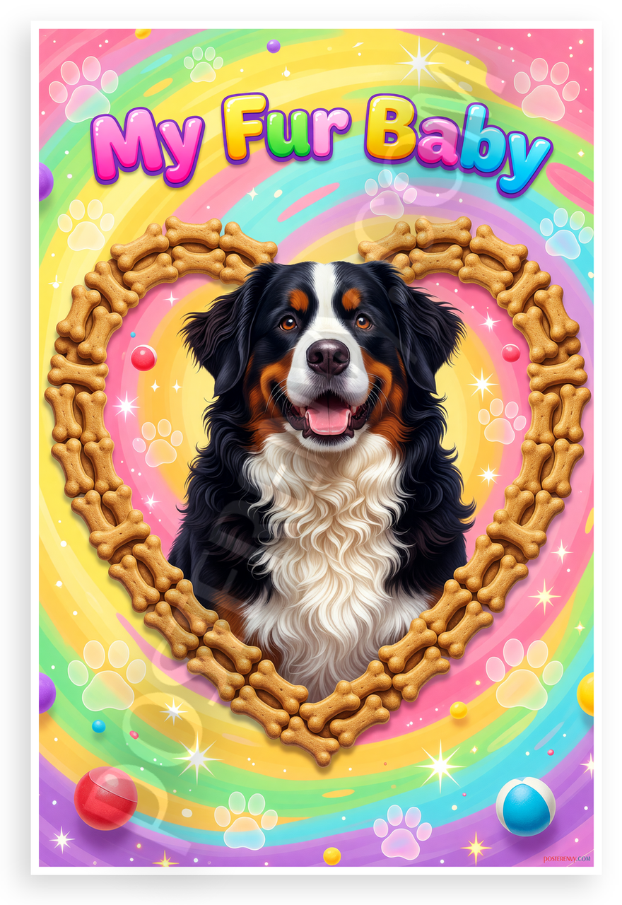 - Premium Print: This PosterEnvy 12x18 inch poster is printed on Durable, Heavy Duty Paper, Designed to last many years. Features whimsical Bernese Mountain Dog in bone heart frame with My Fur Baby text
