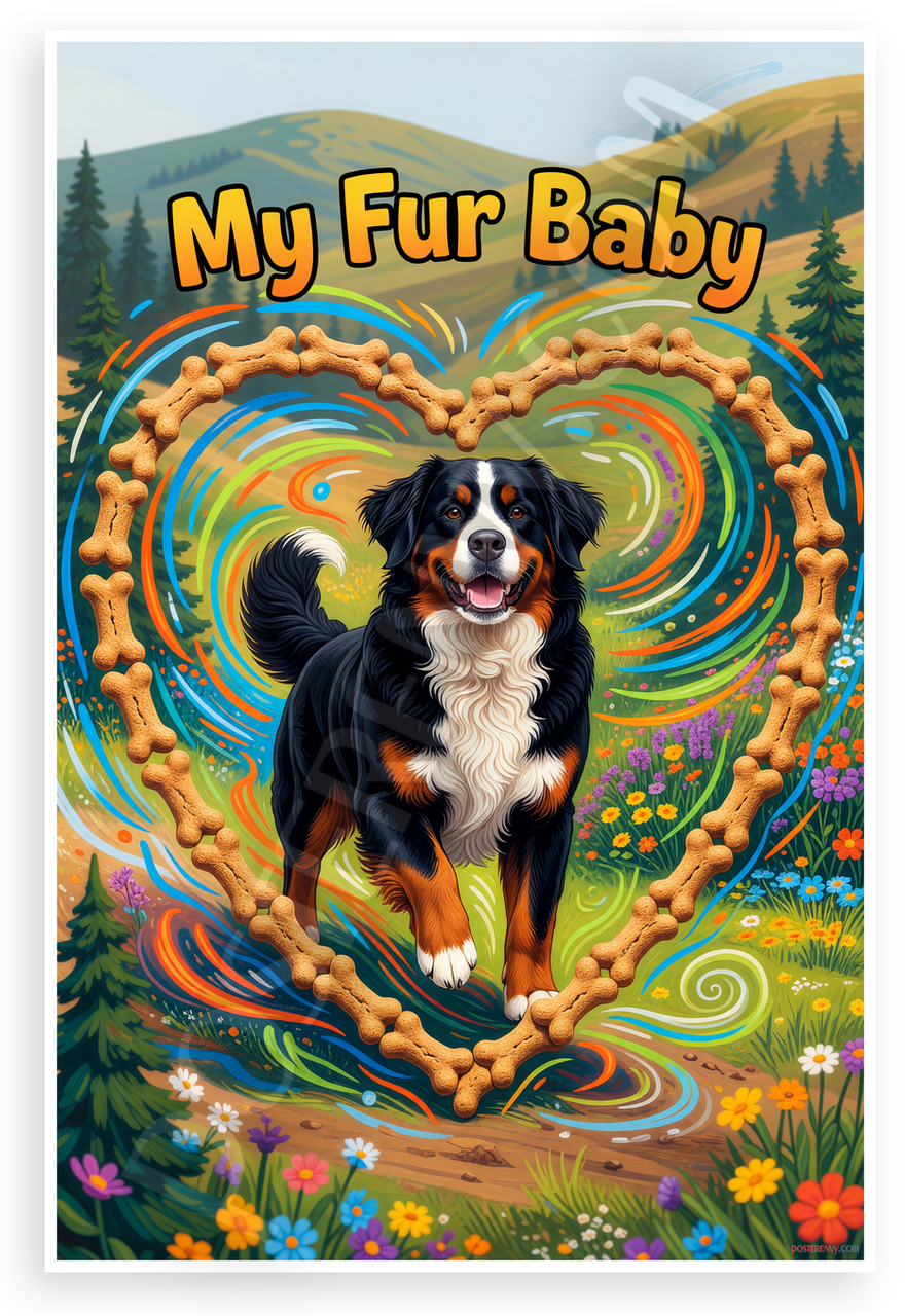 This 12x18 inch poster is printed on premium, durable paper. Proudly Made in the USA by PosterEnvy. The perfect size for any room. PosterEnvy is a family owned business, delivering top-notch posters around the world for over 20 years. Our posters are designed to last — they won't fade or pucker for years of enjoyment. Every poster features crisp, vivid artwork. We are a solar powered company. This vibrant poster showcases a joyful Bernese Mountain Dog in a swirling heart frame of colorful dog bones, set against a lively mountain meadow with flowers and trees. The energetic design captures the spirit of pet love and outdoor adventure.